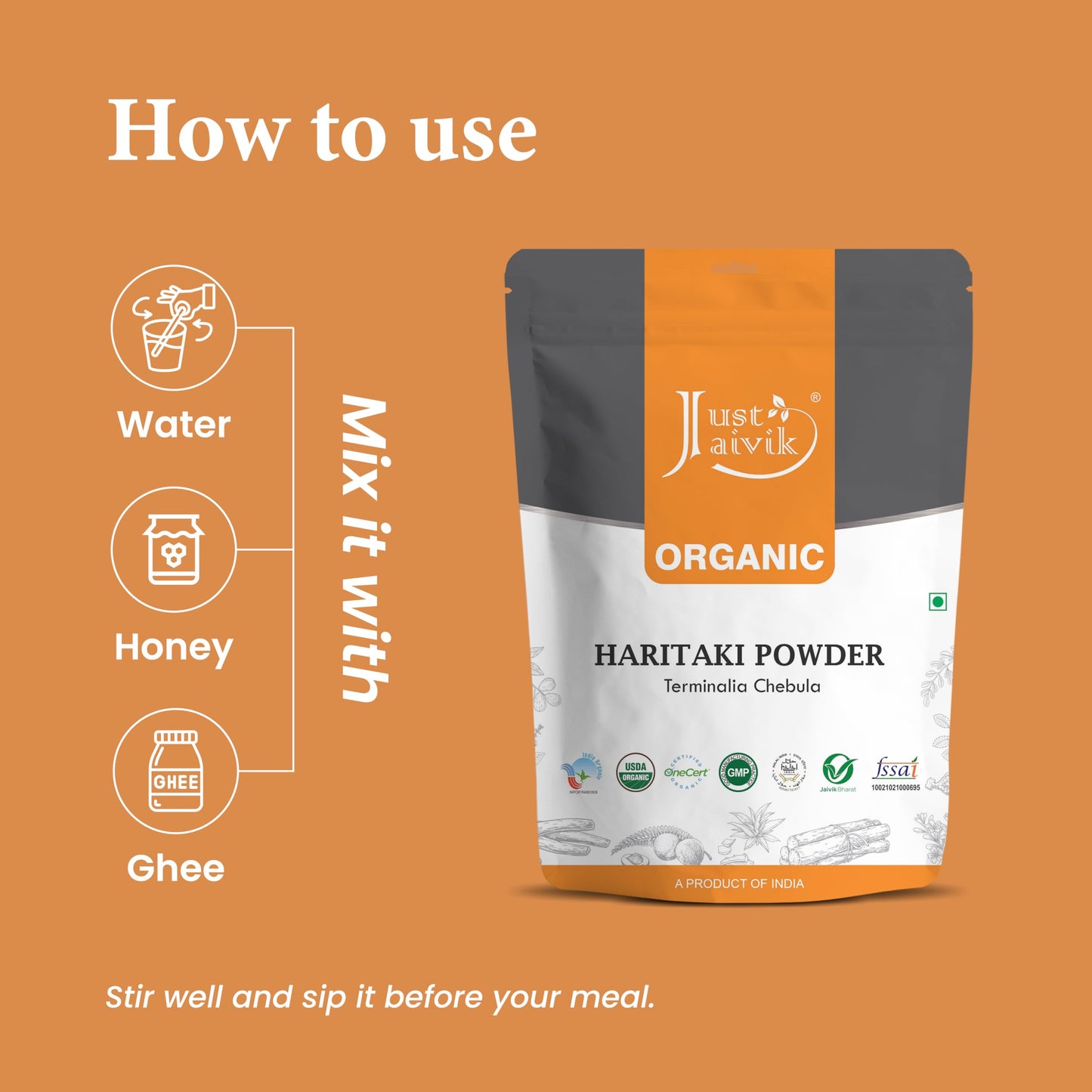 Just Jaivik is committed to producing the highest quality ayurvedic products using usda certified organic herbs that are sustainably sourced and fairly traded. All our products are 3rd party tested and processed in FDA registered facility to ensure product quality and safety