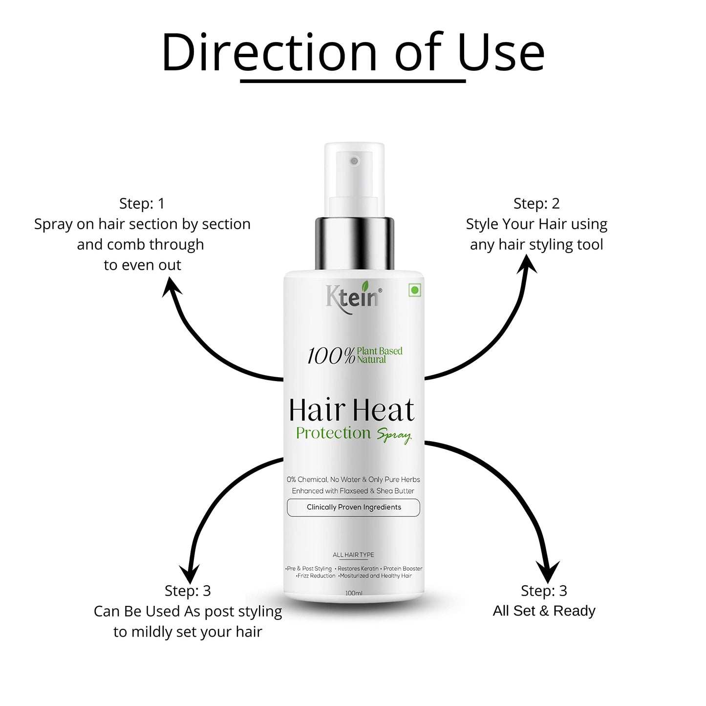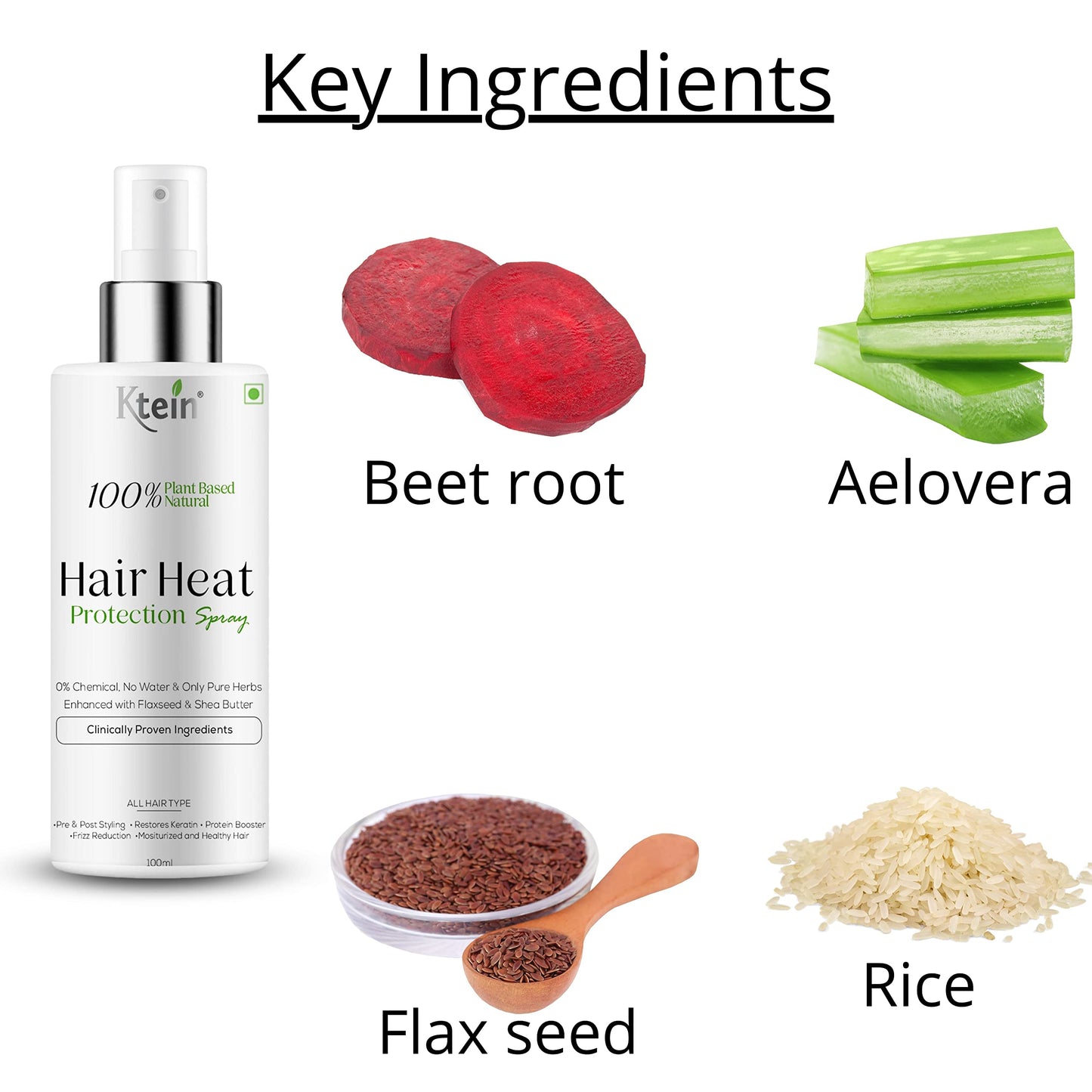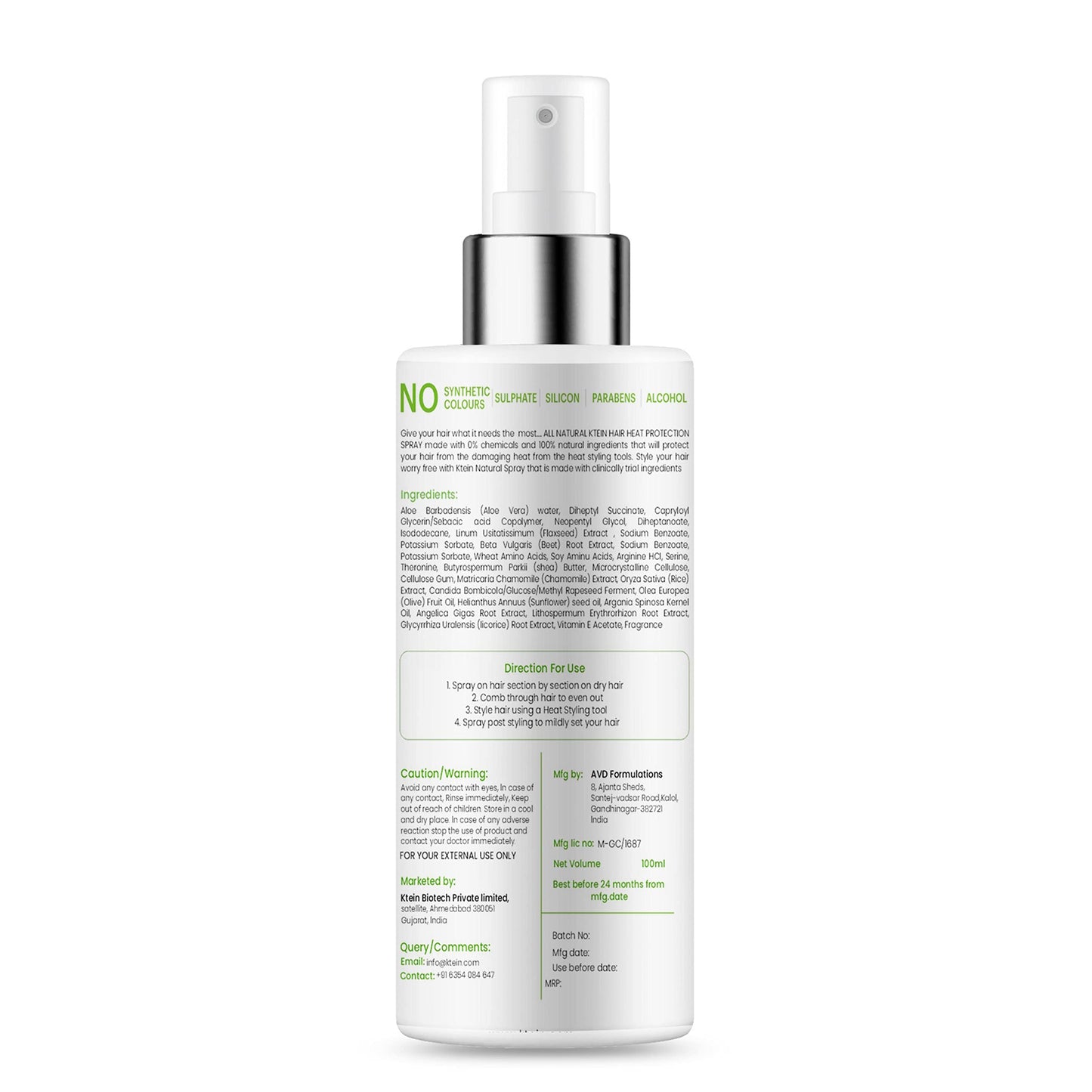 - Ktein 100% plantbased natural Hair Heat Protection Spray provides heat protection to hair cortex and cuticles while reducing hair breakage. This simple natural yet very efficient formula is light and protective with excellent spray ability. It is formulated without Silicones, Alcohol and Polyquaternium or any kind of CHEMICALS or SYNTHETICS. It offers a very soft feel, facilitates combing as well as the straightening process through easier gliding without leaving residue on devices or on hair.