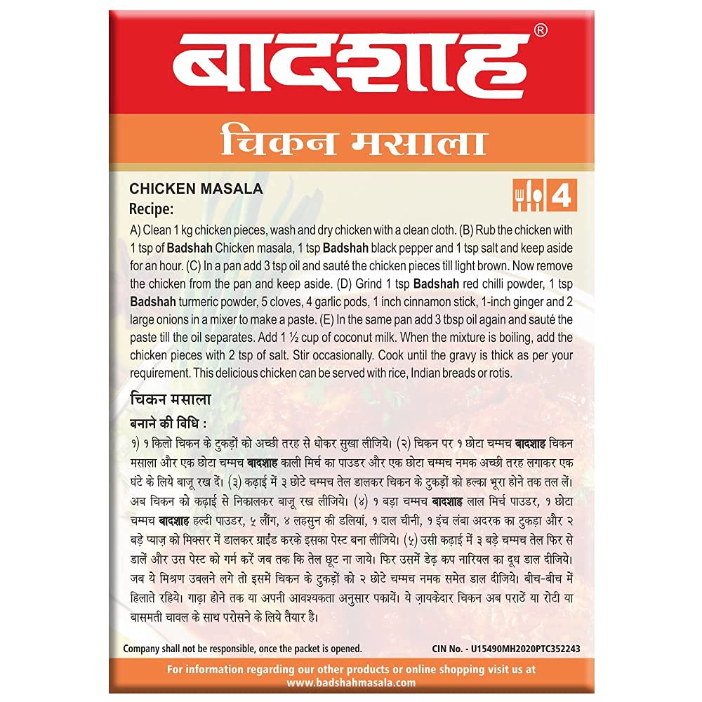 - Upgrade your regular chicken dishes with Badshah Chicken Masala. Prepare the perfect finger licking Chicken Masala dishes at home. A flavourful treat for your loved ones. A delectable mix of pre-blended ingredients and spices.