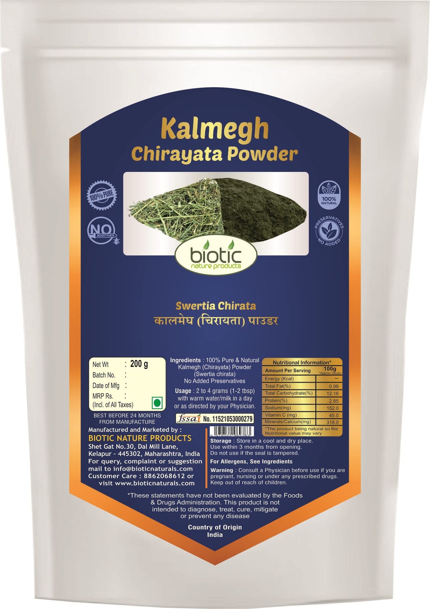 Biotic Kalmegh Powder | Swertia Chirata | Nilavembu | Chiraita | Chirayata - 200 gm