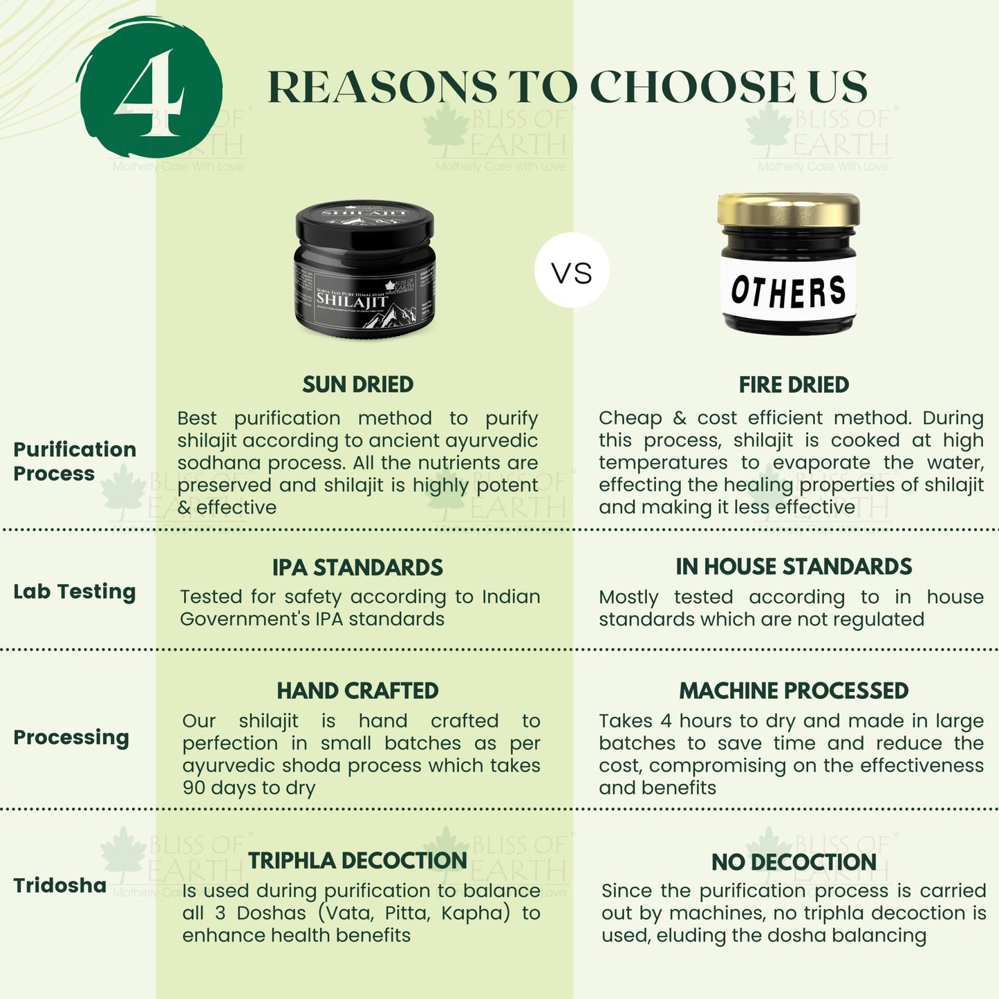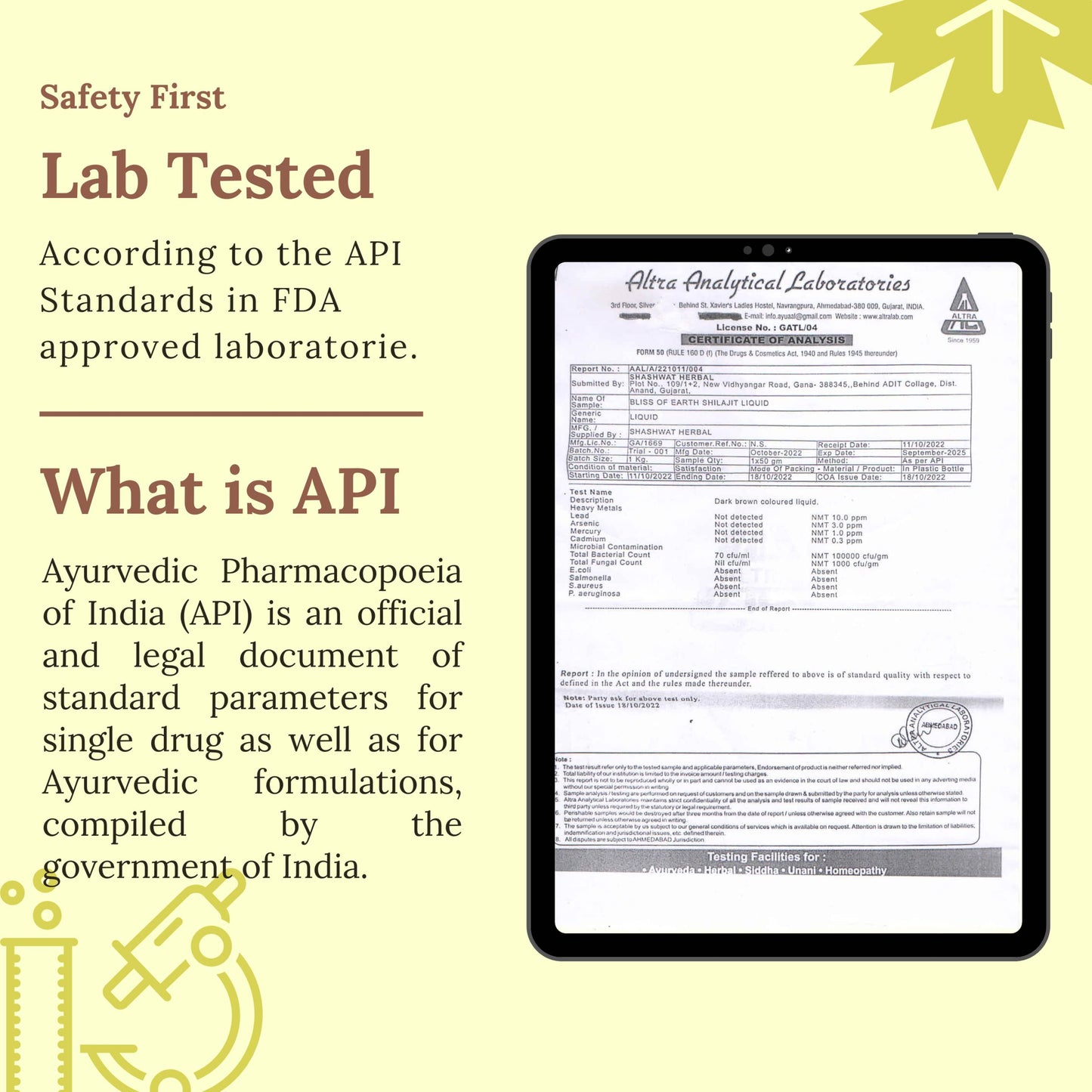 - LAB TESTED AS PER API: Our shilajit is tested for safety according to Ayurvedic Pharmacopoeia of India (API) standards. API is a Government of India official and legal document of standard parameters for ayurvedic formulations. This makes Bliss of Earth Shilajit free from pesticides or any chemicals thus, ensuring the purest, most pristine avatar of Shilajit.