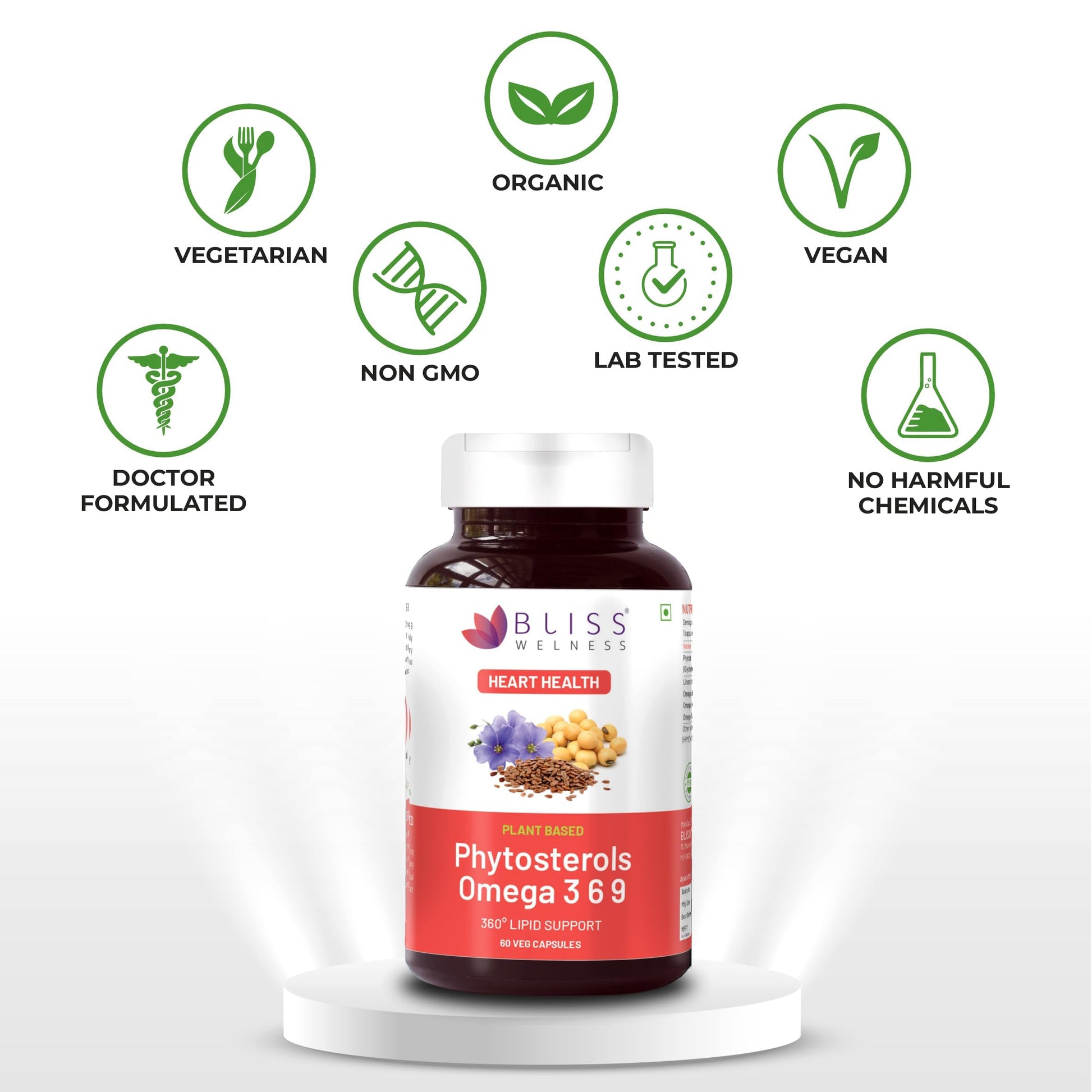 Bliss Welness Cholesterol Management Heart Health | Omega 3 6 9 + Phytosterol Plant Sterols | Lipid Profile Immunity Support Supplement - 60 Vegetarian Capsules