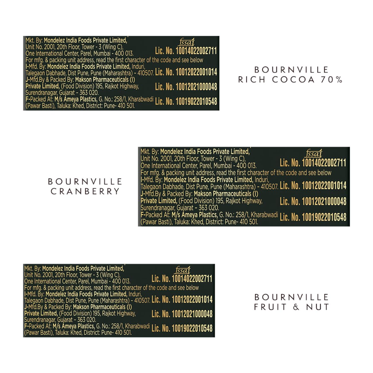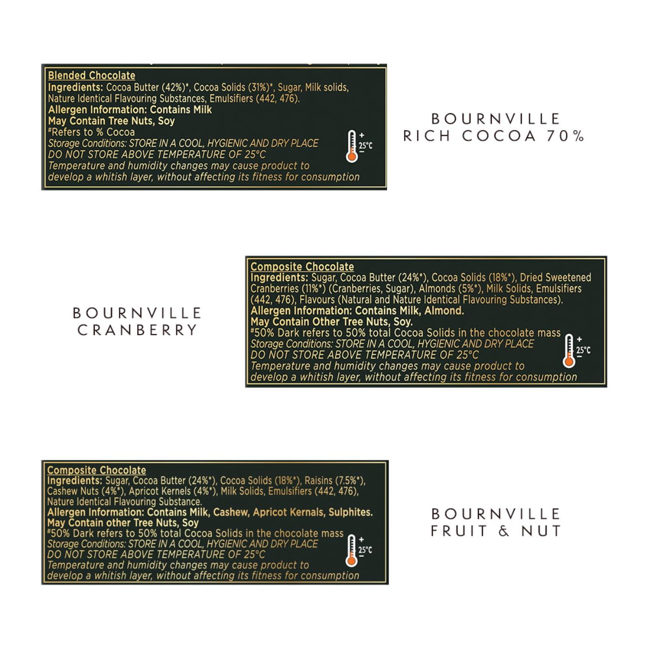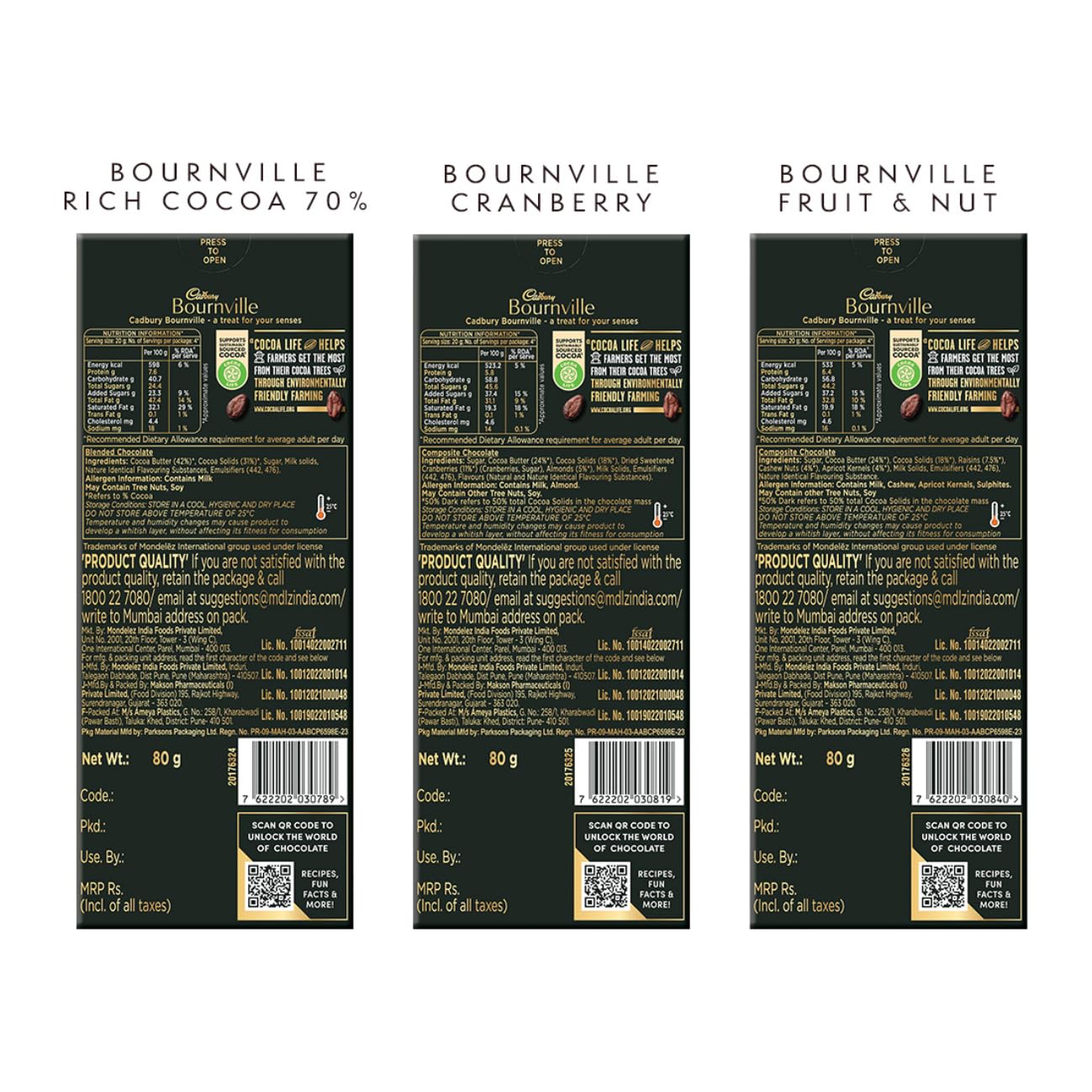 - This pack contains 2 bars of Cadbury Bournville Raisin and Nuts Dark Chocolate Bar, Cadbury Bournville Cranberry Dark Chocolate Bar, Cadbury Bournville Rich Cocoa 70% Dark Chocolate Bar, 80 g each & is delivered with a cool gel pack