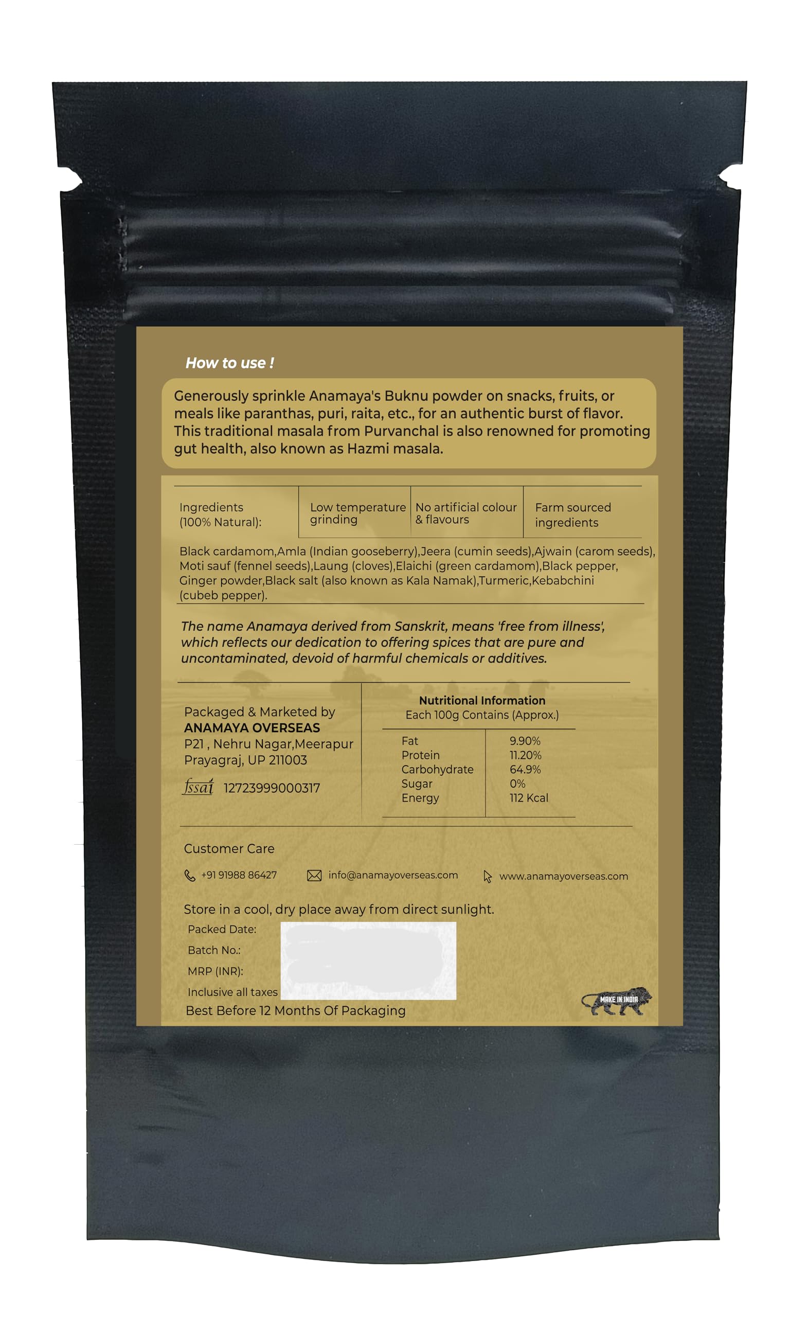 Buknu Masala Kanpur 50 gms from Anamaya Spices | Buknoo Masala Kanpur | Kanpuriya Bukni | Hazmi Masala | Bhuknu seasoning for curd, paratha, Chapathi, Mathri, etc |