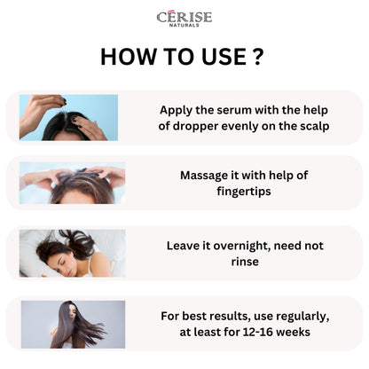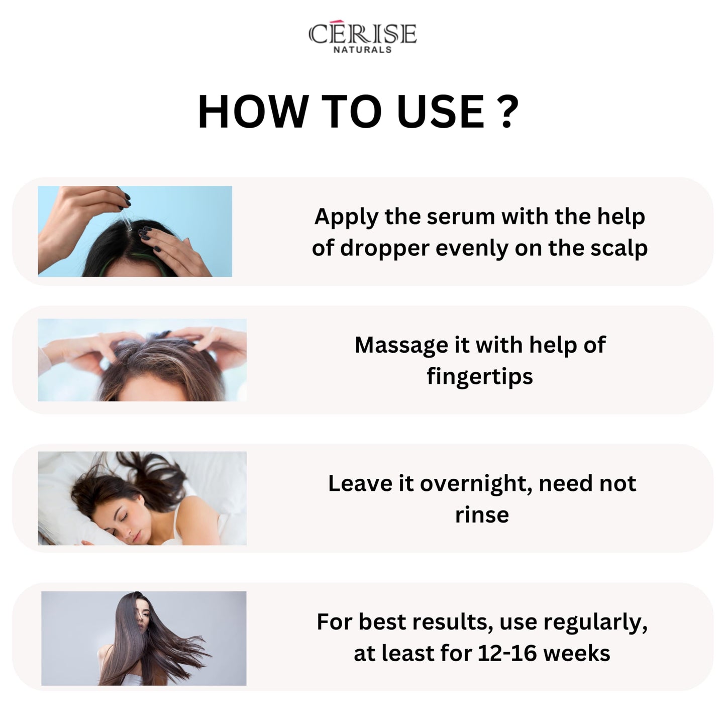 - HOW TO USE? : We recommend applying every night with the help of dropper. Apply on clean hair & scalp followed by a gentle massage for 2-3 minutes. Leave overnight for the serum to work while you are sleeping.