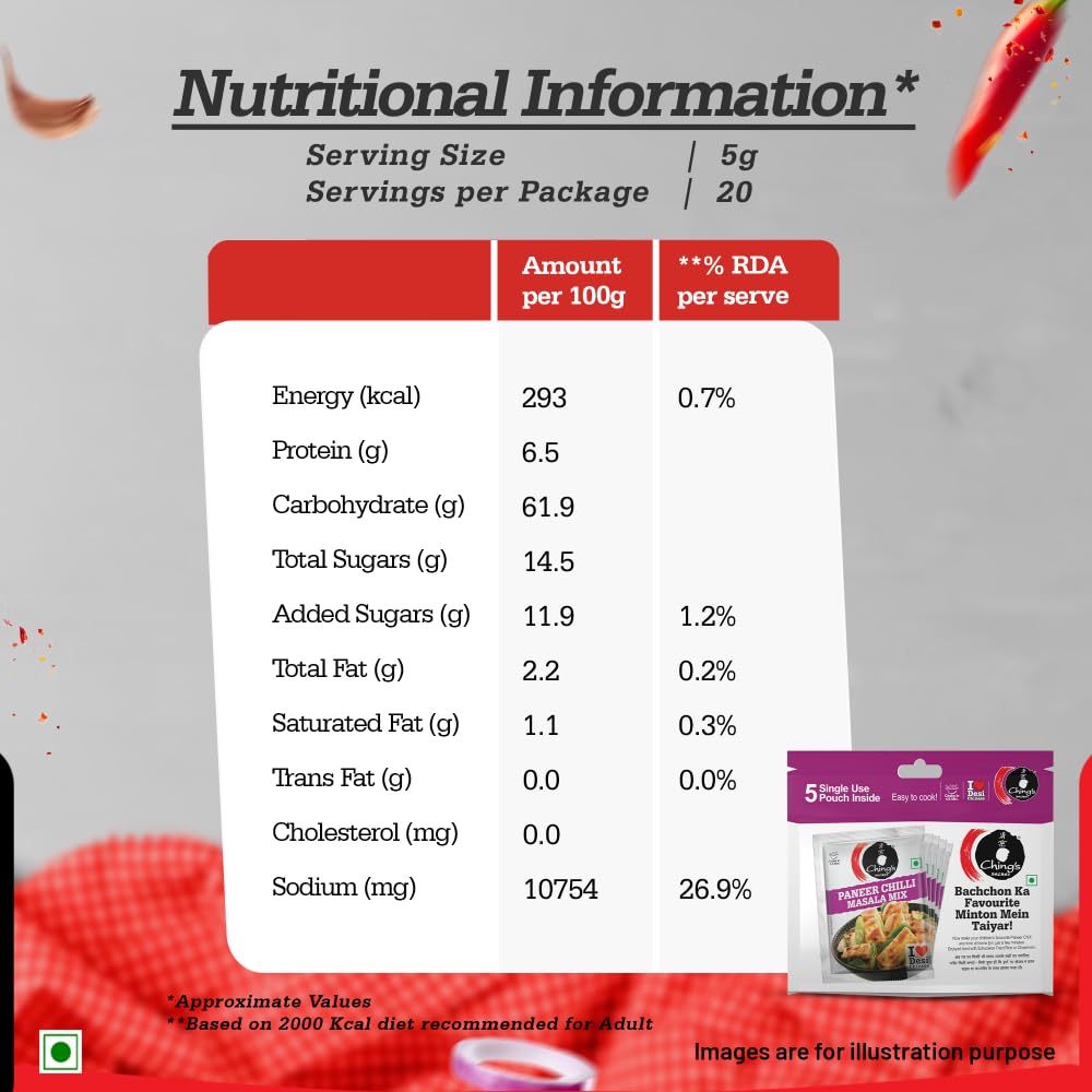 Ching’s Secret Paneer Chilli Masala Mix, 100g, Easy To Cook, Meal Kit, Cooks in 4/5Mins, 1 Pouch Serves 4, Pack of 5 Single Use Pouches