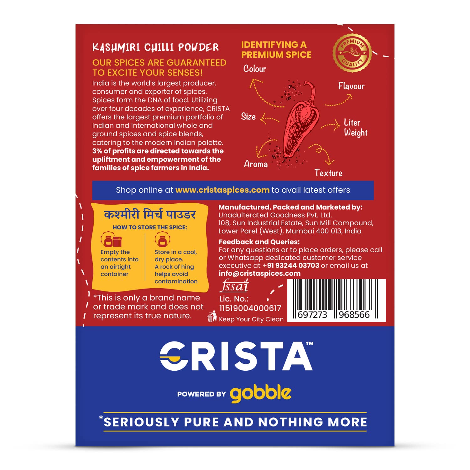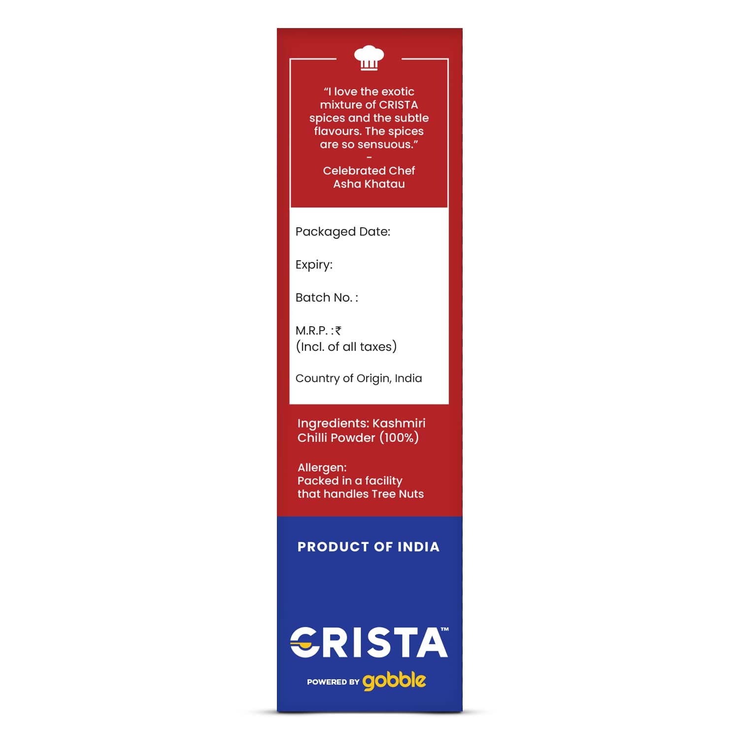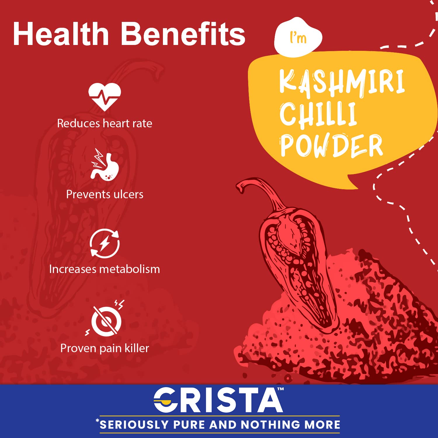 - CRISTA Kashmiri Chilli Powder adds a vibrant red colour to everyday Indian cooking.
