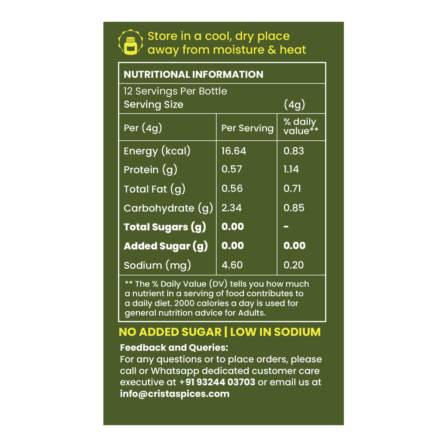 - Store in a cool, dry place away from moisture & heat.
