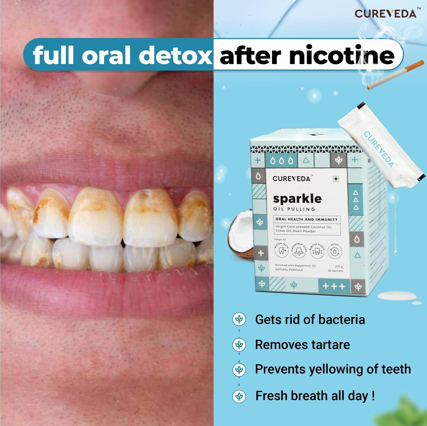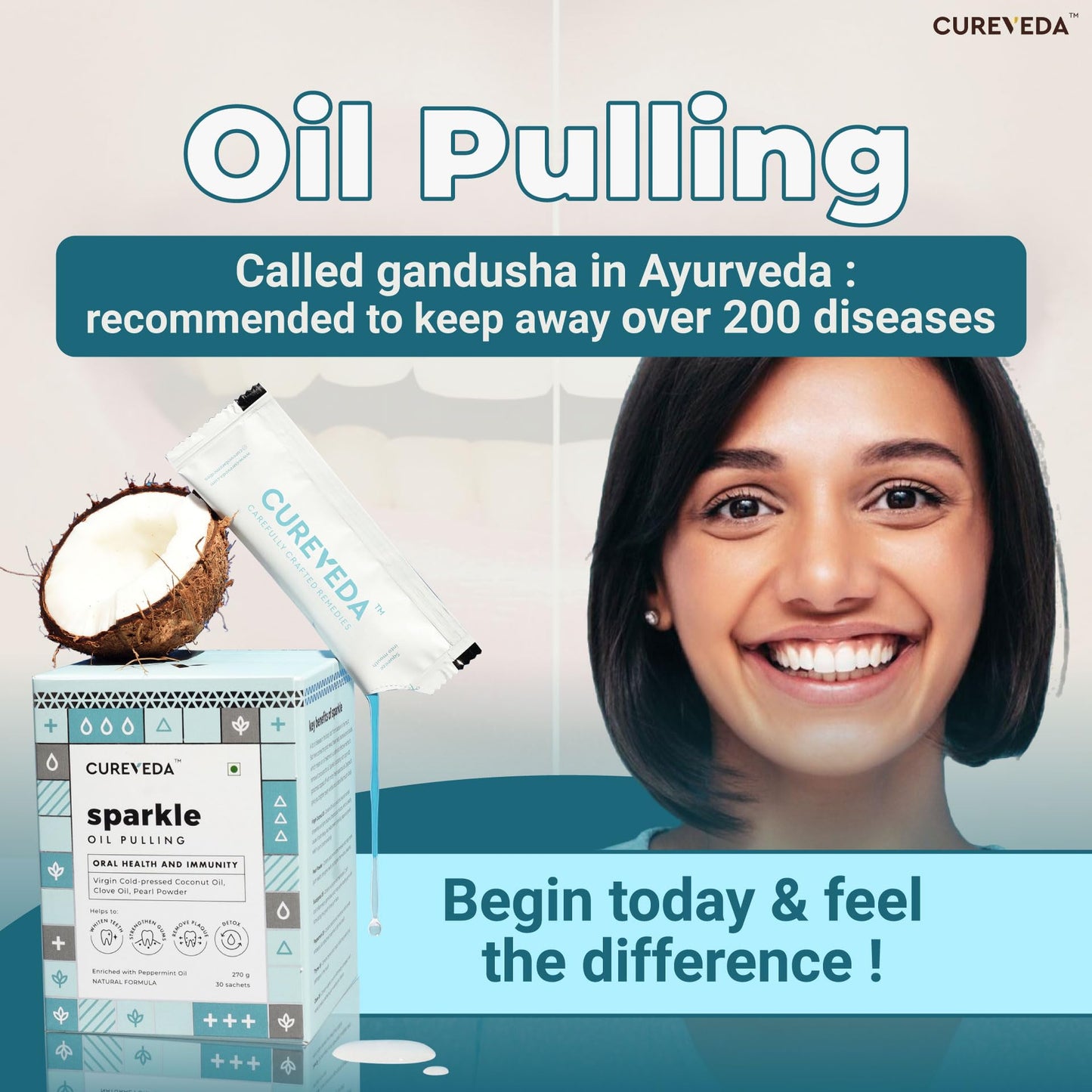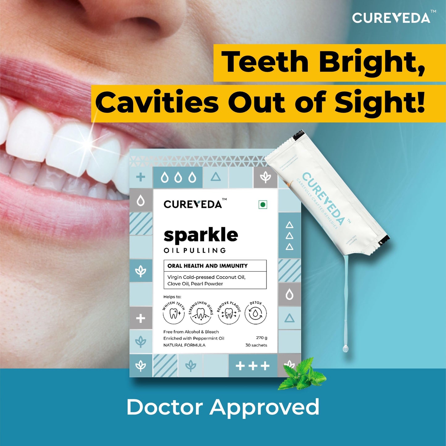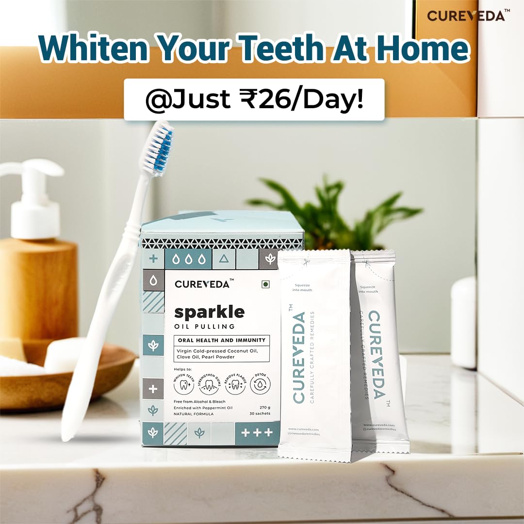 Cureveda Sparkle Oil Pulling for Mouth, Teeth & Immunity | Virgin Coconut Oil, 4 essential oils, Pearl powder - 30 sachets