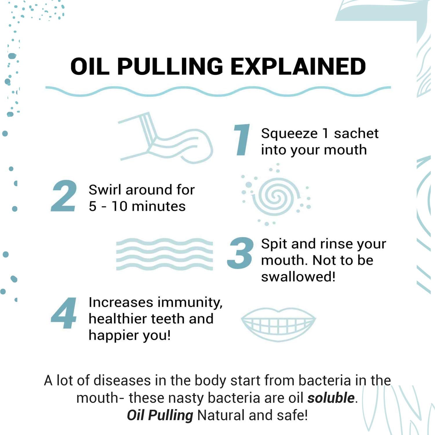 - Begin each day with the ancient India remedy of oil-pulling to get ride of bacteria and toxins and build your body’s natural defences. A small change in your routine - a life-long healthy habit.