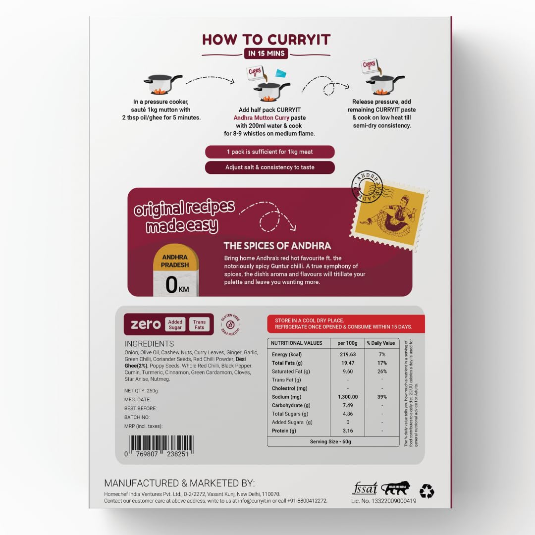 CURRYiT Andhra Mutton Masala Curry Paste 250g | Ready to Cook in 15 mins | Serves 6 | Just add Fresh Chicken, Mutton, Meat, Fish | Made with Ghee | No Preservatives | Eat with Rice | Indian Masala Gravy