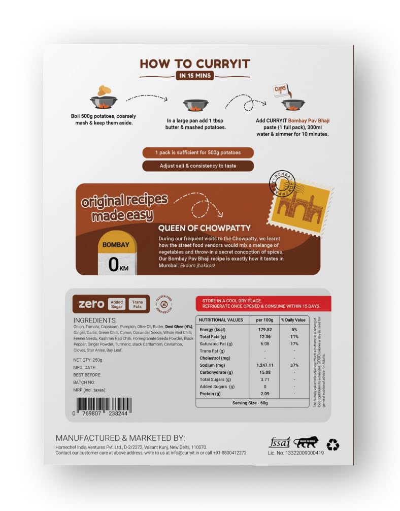 CURRYiT Instant Bombay Pav Bhaji Masala Curry Paste | Just Add Aloo (Potato) | Ready in 15-30 Mins | Serves 4-6 | Made with Ghee | No Preservatives | Ready To Cook Indian Masala Gravy | 250g