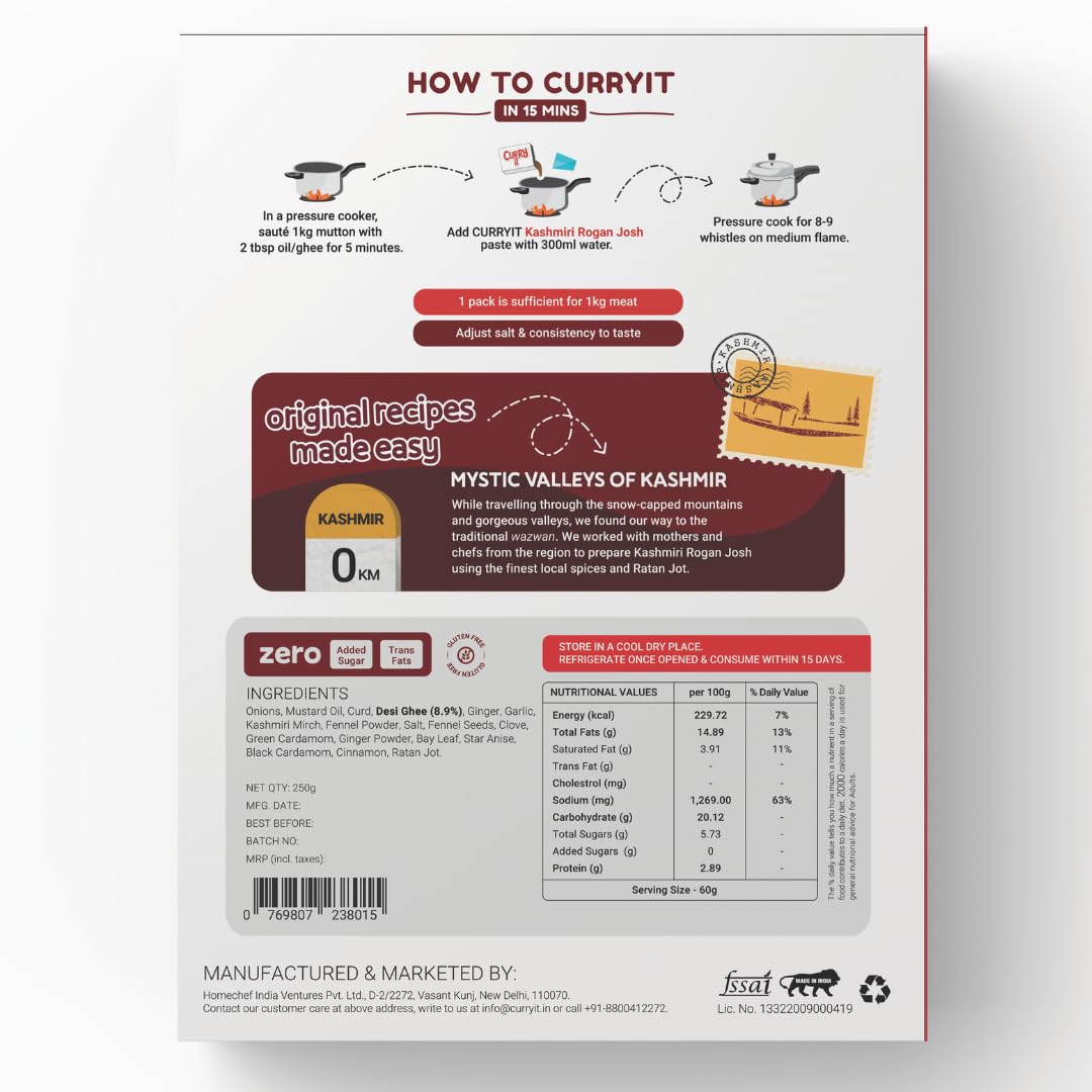 CURRYiT Kashmiri Rogan Josh Curry Paste 250g | Ready to Cook in 15 mins | Serves 6 | Just add Fresh Mutton, Chicken, Meat, Fish | Made with Ghee | No Preservatives | Eat with Khameeri Roti | Indian Masala Gravy