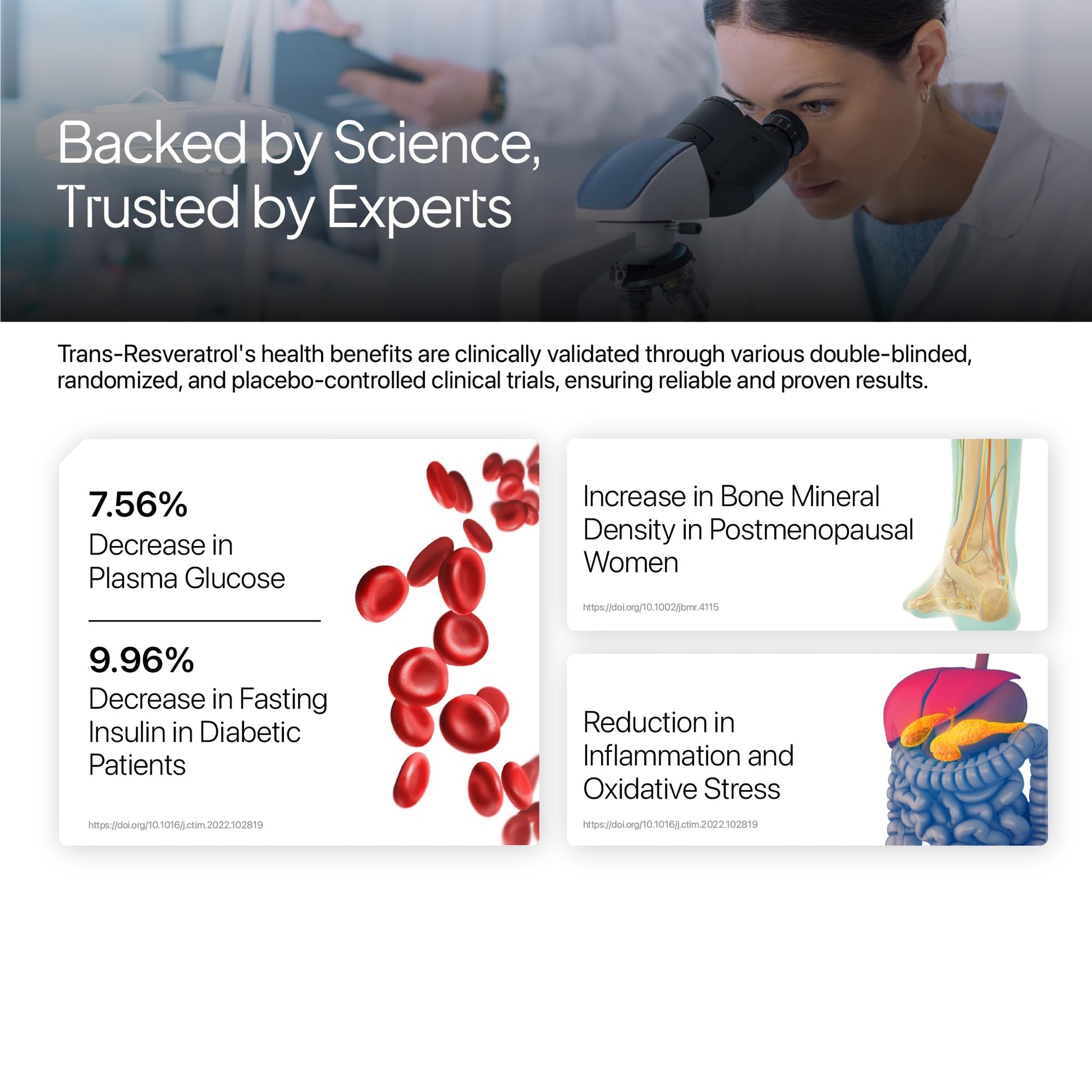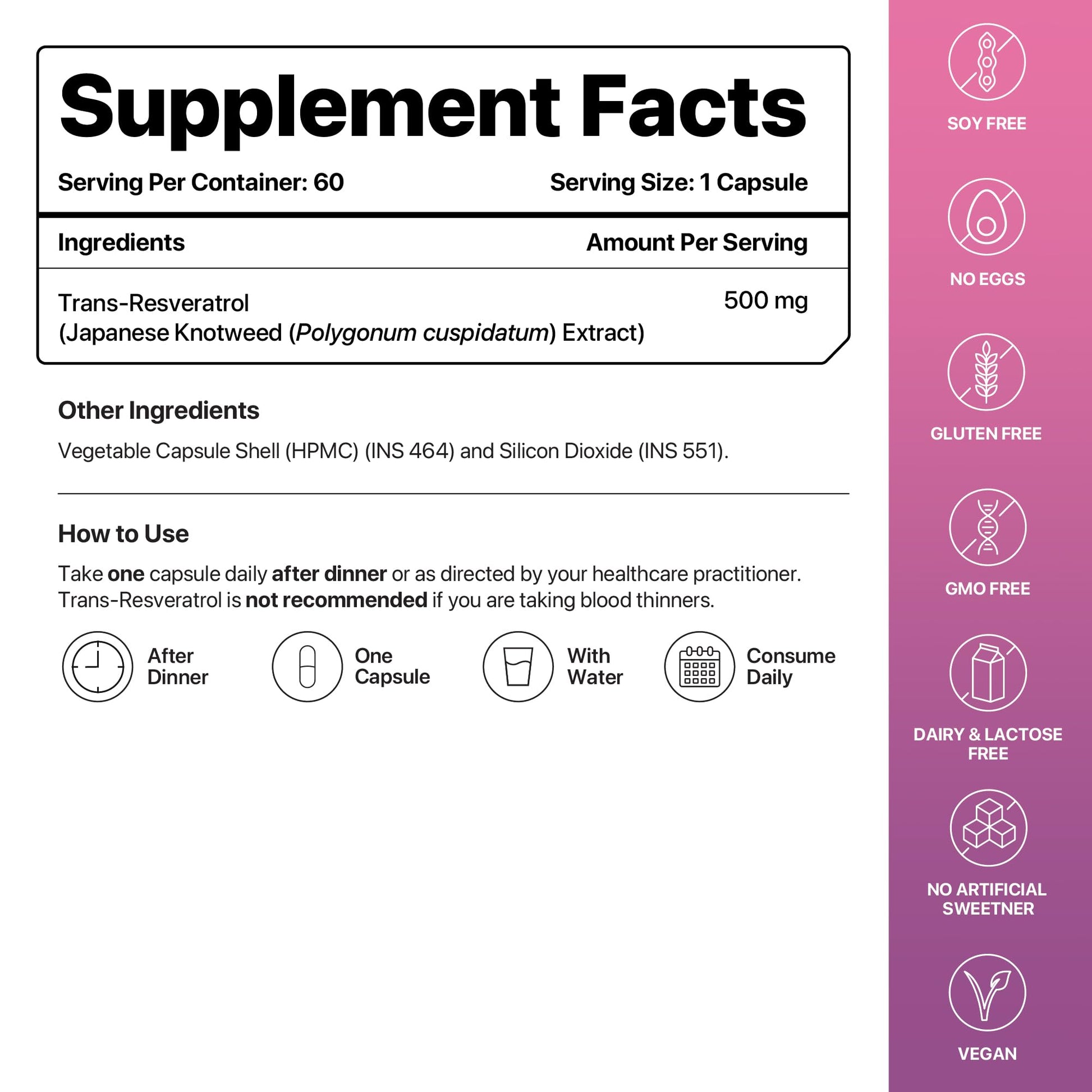 - Heart Health and Anti inflammatory Supplement: Trans resveratrol helps keep your heart healthy by reducing inflammation and oxidative stress.