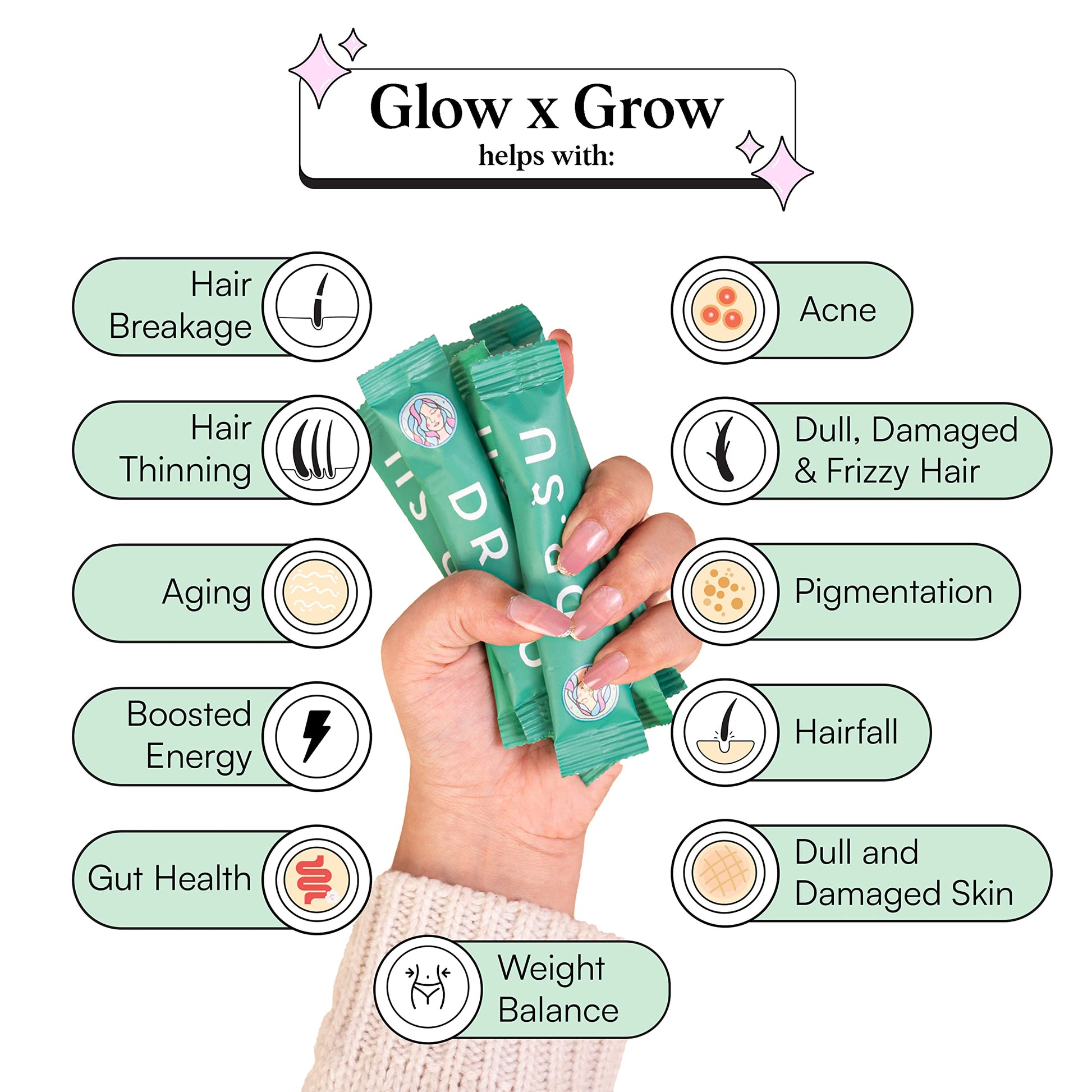 - 1 month supply: One pouch of Dr Su Glow x Grow for glowing skin, stronger hair and healthy gut comes with 30 travel friendly sachet!