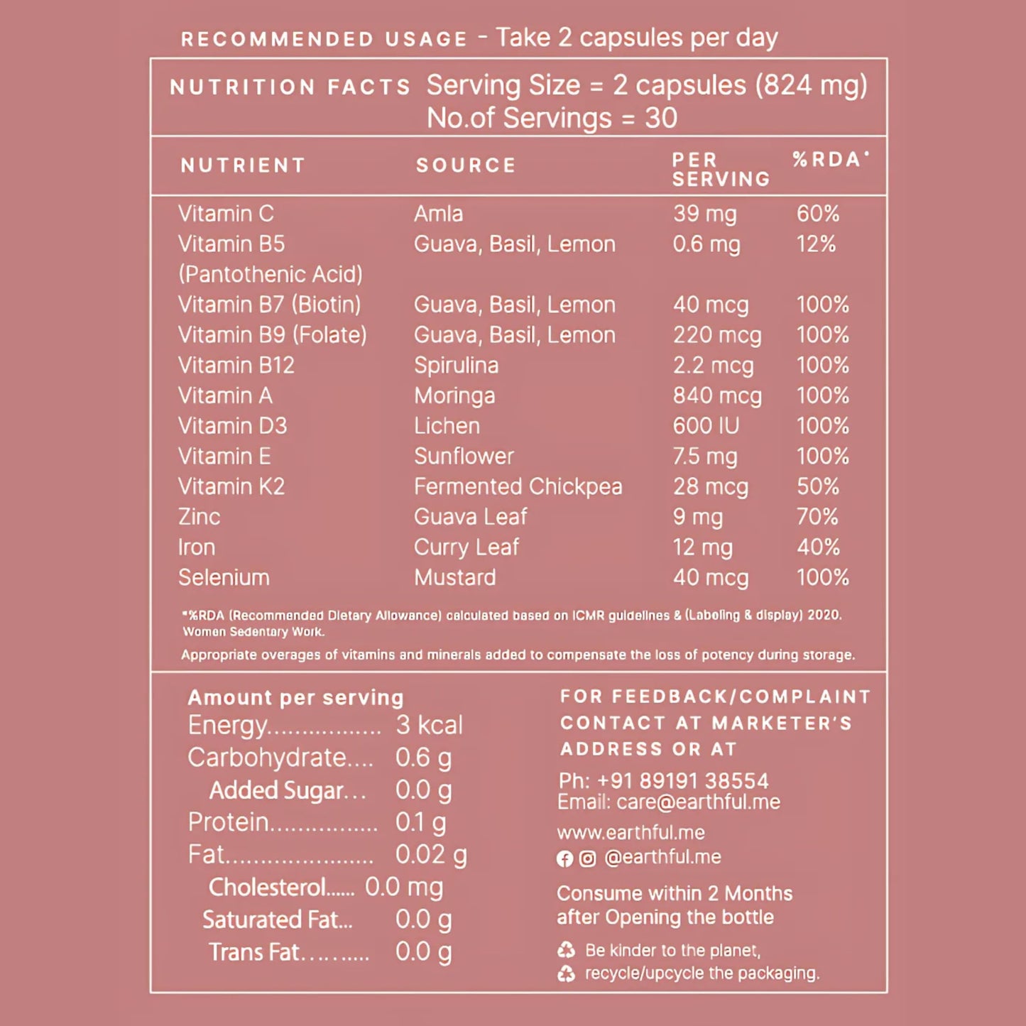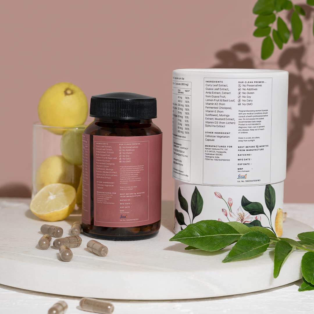 - SOURCES: Iron - From Curry Leaf, Vitamin D3 - From Lichen, Vitamin C - From Amla, Vitamin E - From Sunflower, Vitamin K2 - From Fermented Chickpea, Folate & Biotin- From Guava, Basil & Lemon, Zinc - From Guava Leaf, Selenium From Mustard, Vitamin A From Moringa