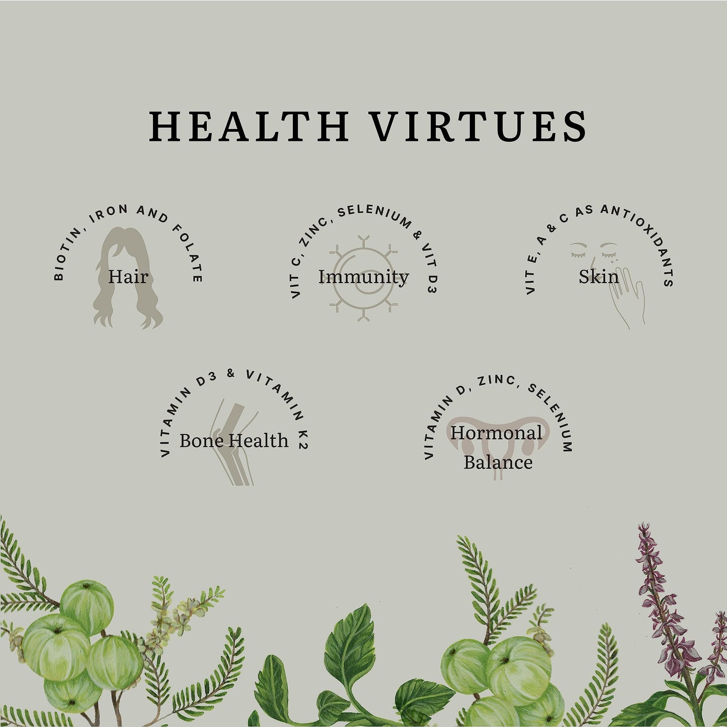 - IMMUNITY BOOSTER- Vitamin C, Zinc, Vitamin D3 & Selenium. BONE HEALTH - Vitamin D3 & Vitamin K2 enhances Calcium absorption from diet. SKIN - Vitamin E, Vitamin C & A are great antioxidants. HAIR GROWTH- Biotin, Iron and Folate enrich the hair. HORMONAL BALANCE- Vitamin D3, Zinc & Selenium.