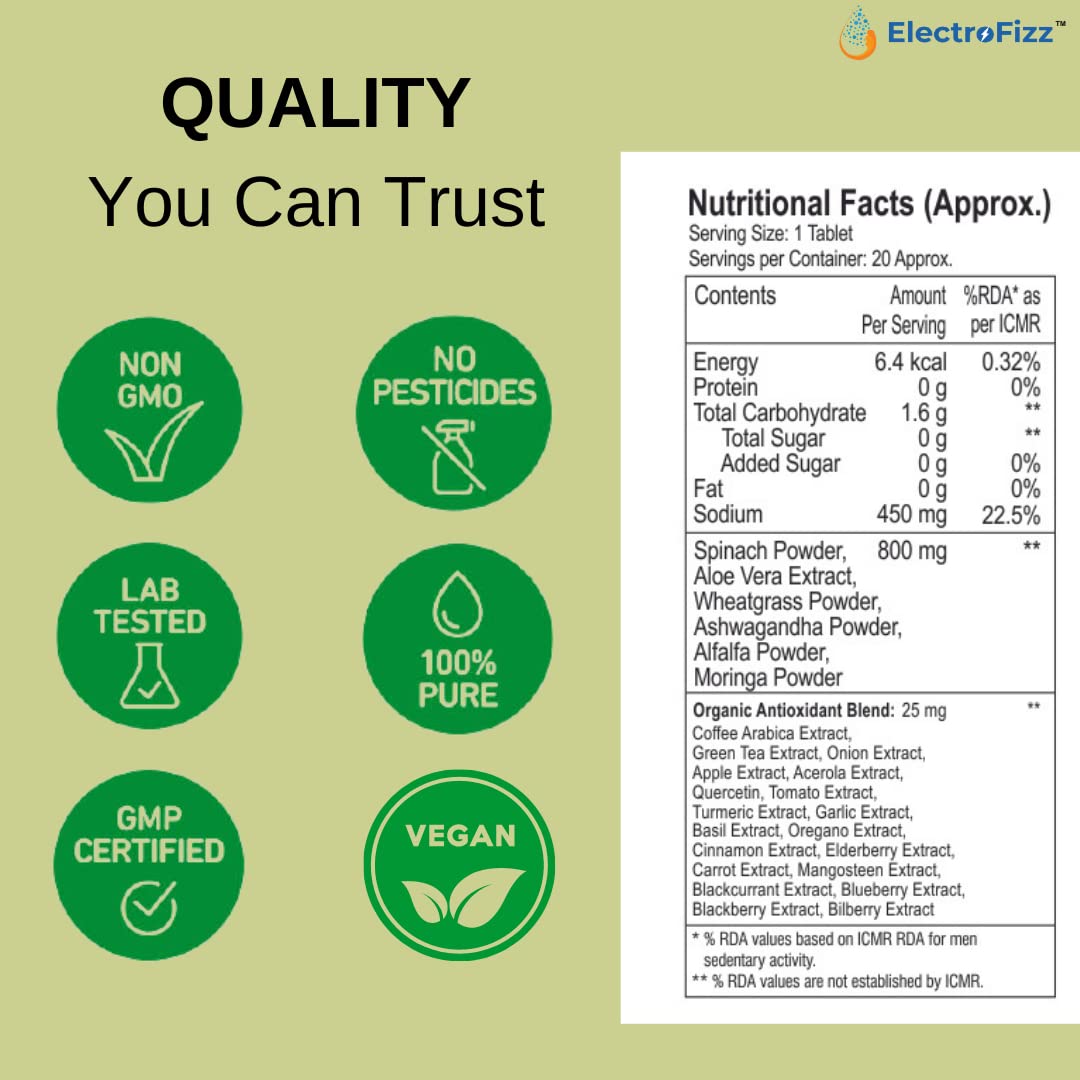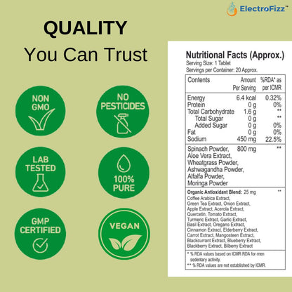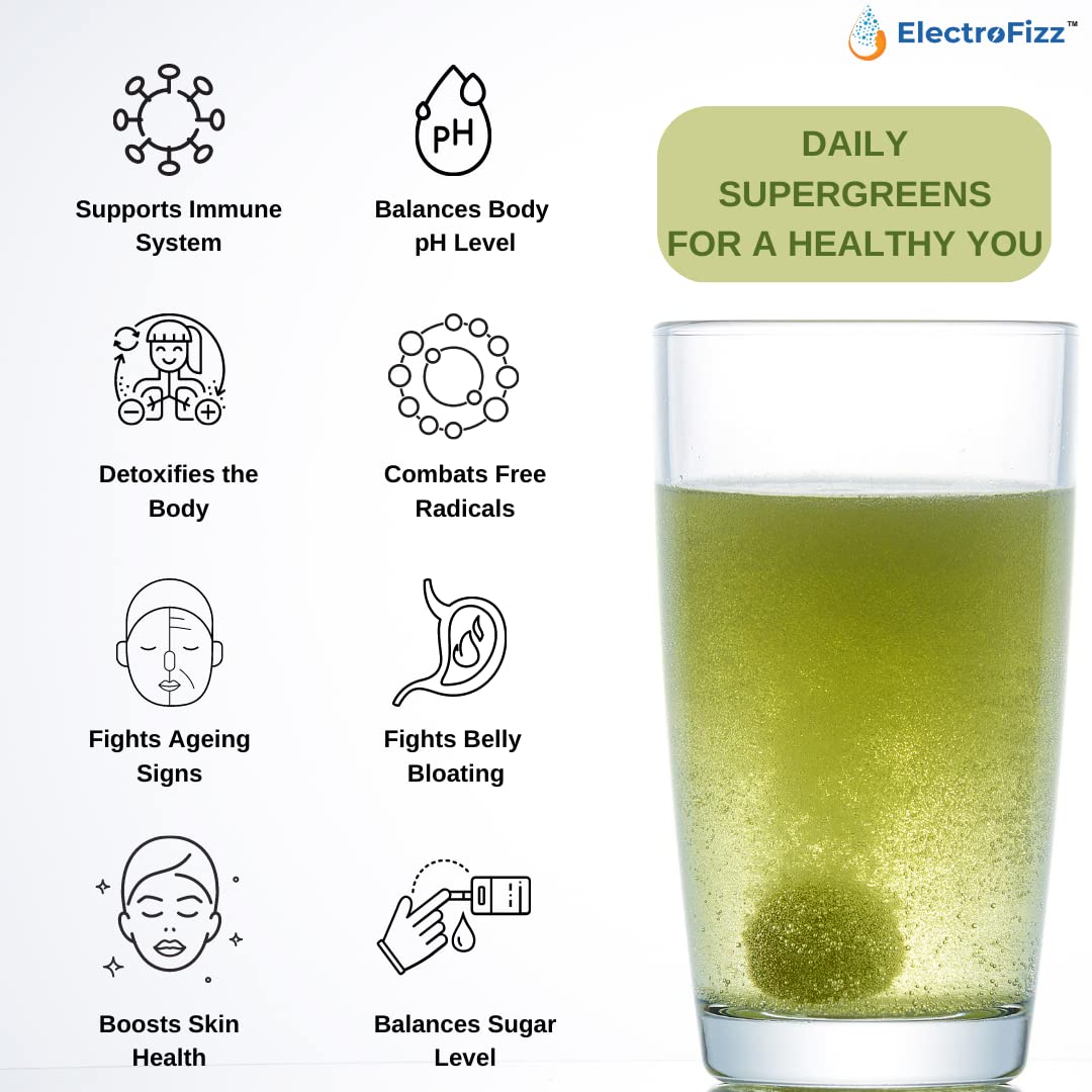 ElectroFizz Supergreens Superfood, Greens, Fruits &Herbs -Spirulina, Moringa, Wheat Grass etc,Boost ce Health & Immunity (Effervescent Tabs Pack of 2)