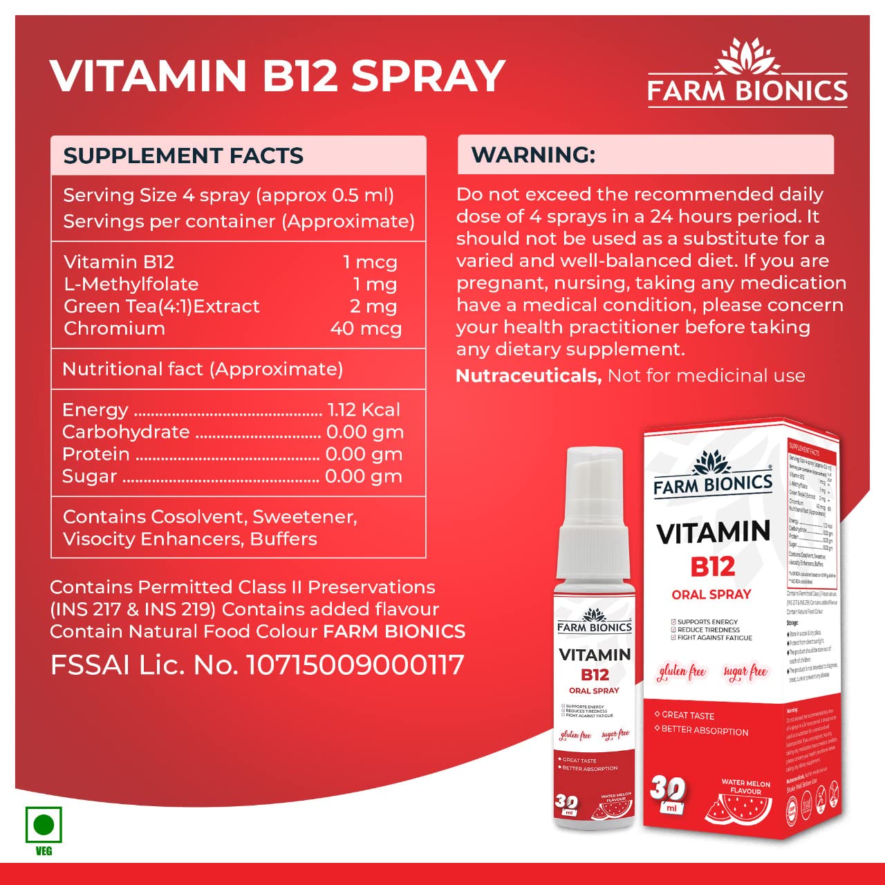 - 60-DAY SUPPLY - FARM BIONICS Vitamin B12 Spray contains a 60-Day supply of the B12. It is vegetarian, gluten-free, and sugar-free. Ideal for everyday use