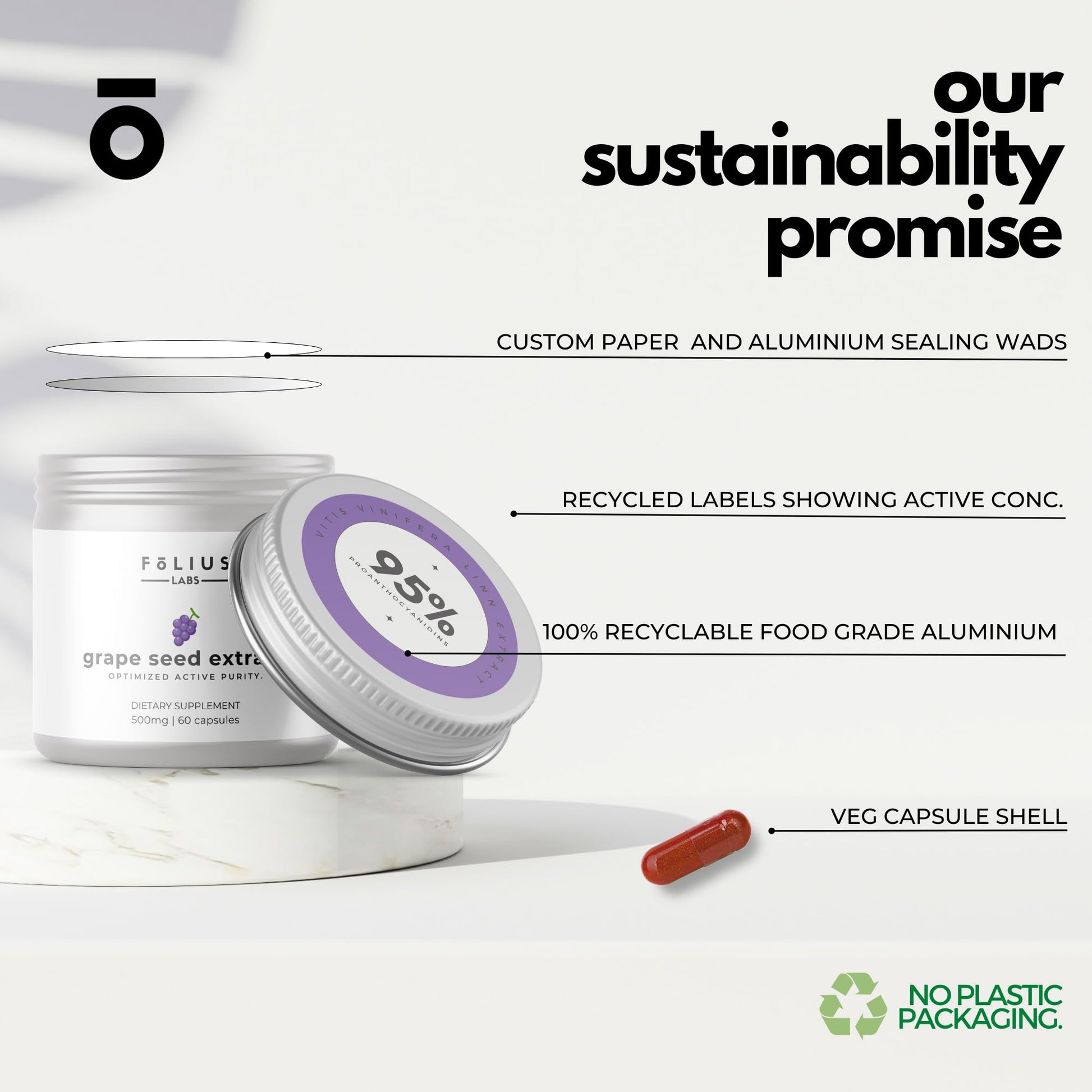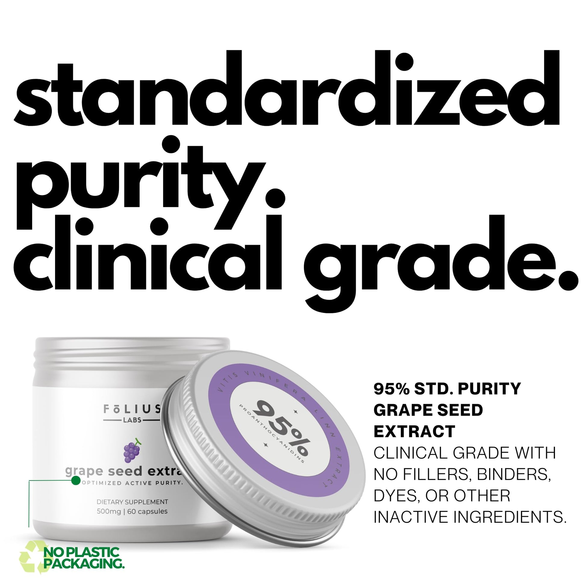 FOLIUS LABS Grape Seed Extract 500mg - 95% OPCs Polyphenols - High Strength Grape Seed Supplement - Support cardiovascular health – 60 Capsules