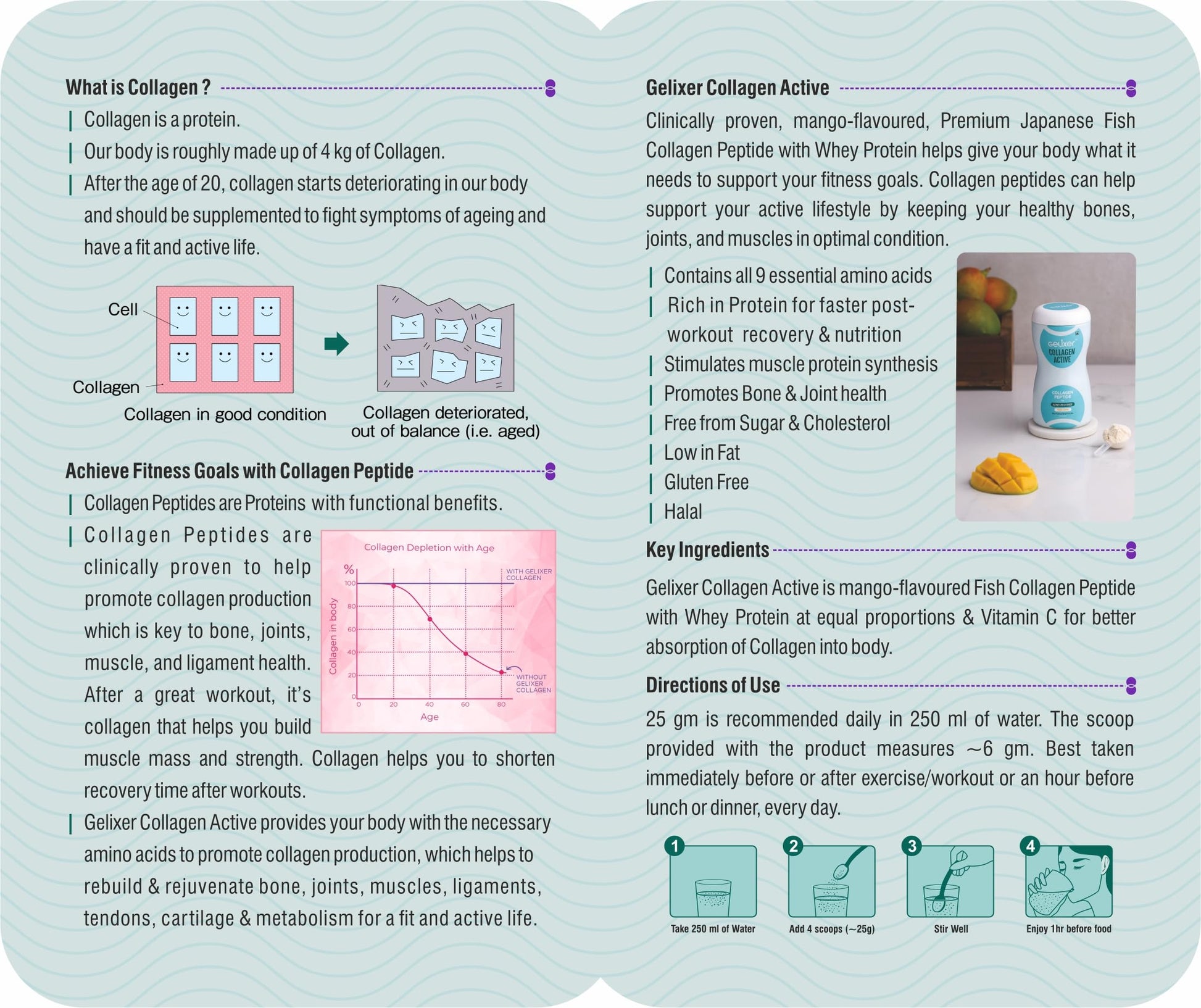 - Mango Flavoured Active Formula: Gelixer Collagen Active combines Premium Japanese Fish Collagen Peptide with Whey Protein to fuel your fitness journey.