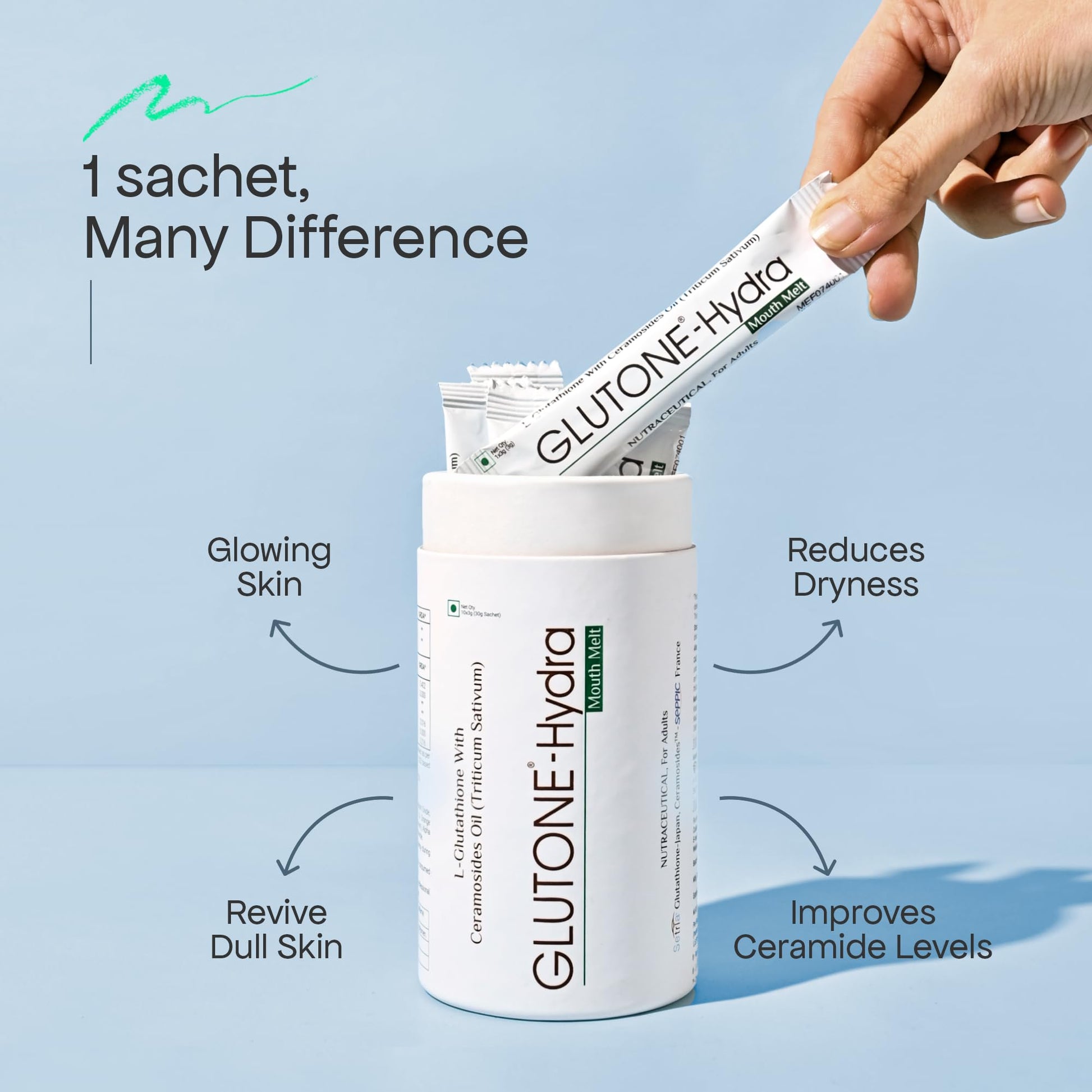 - WHAT IS GLUTONE-HYDRA MOUTH MELT: Discover the ultimate skincare innovation with Glutone-Hydra Mouth Melt, a unique supplement crafted to hydrate and nourish your skin from within. Each sachet combines Setria Glutathione from Japan and Ceramosides from France, delivering a potent blend designed to enhance your skin's radiance, hydration, and overall health.