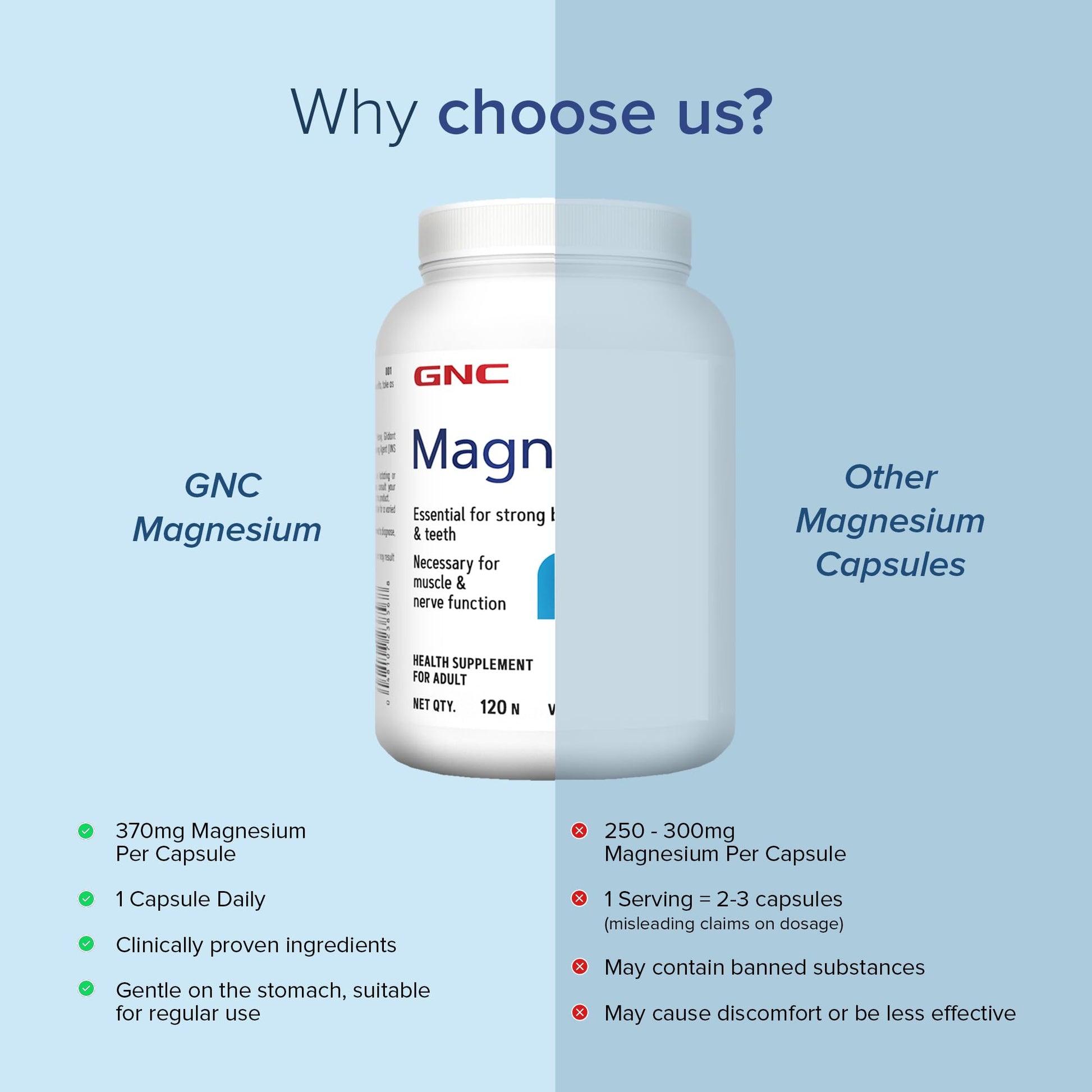 GNC Magnesium 370mg | 120 Veg Capsules | For Bone Strength, Muscle & Nerve Function, Stress Relief, Improved Sleep, Mood Elevation, Essential Mineral for Calcium Absorption & Cell Function