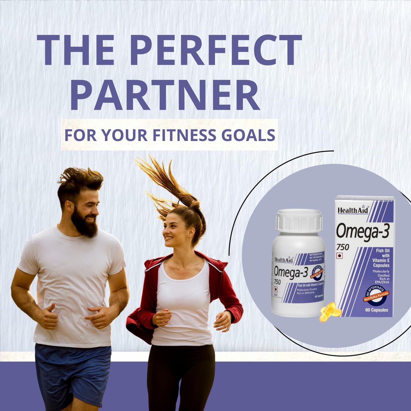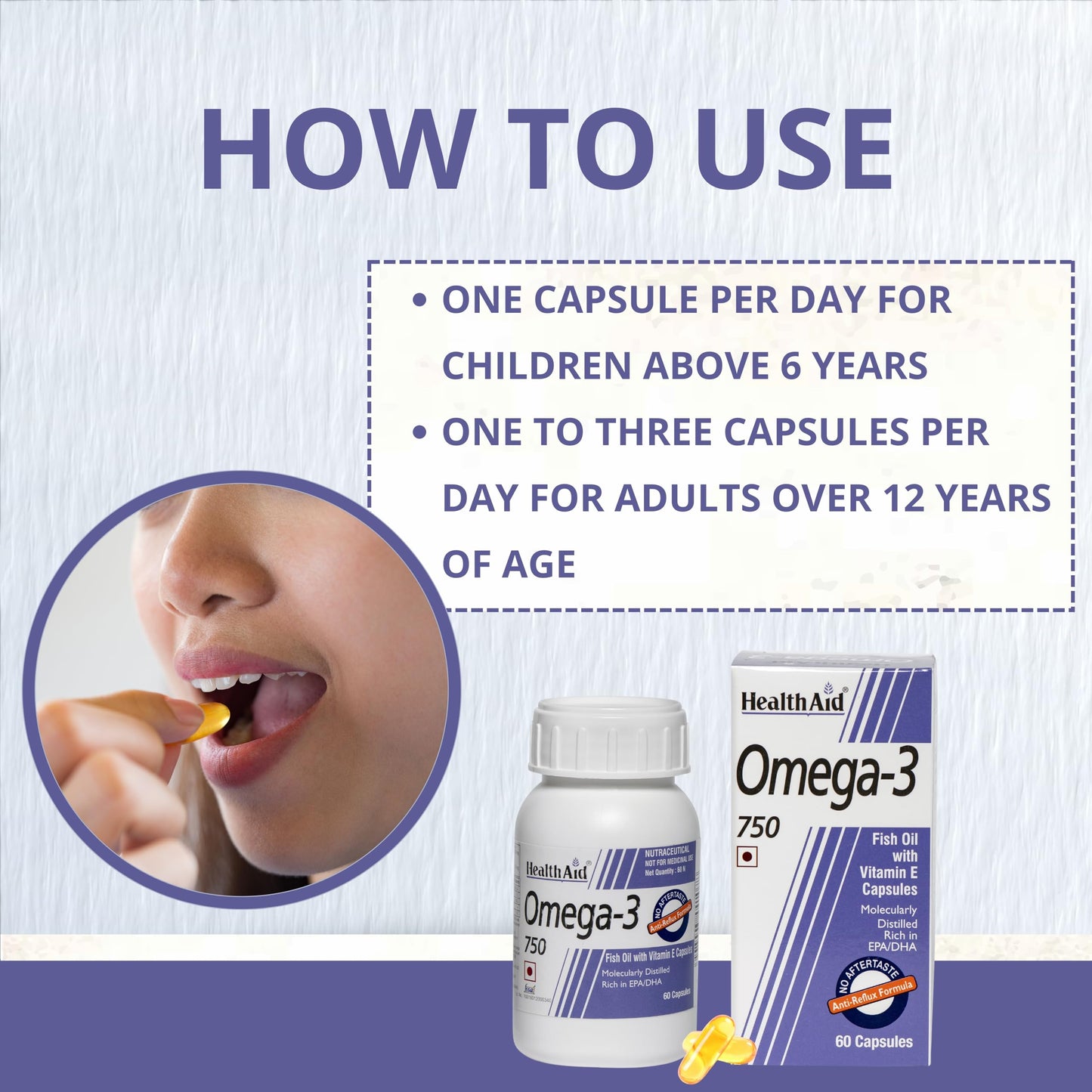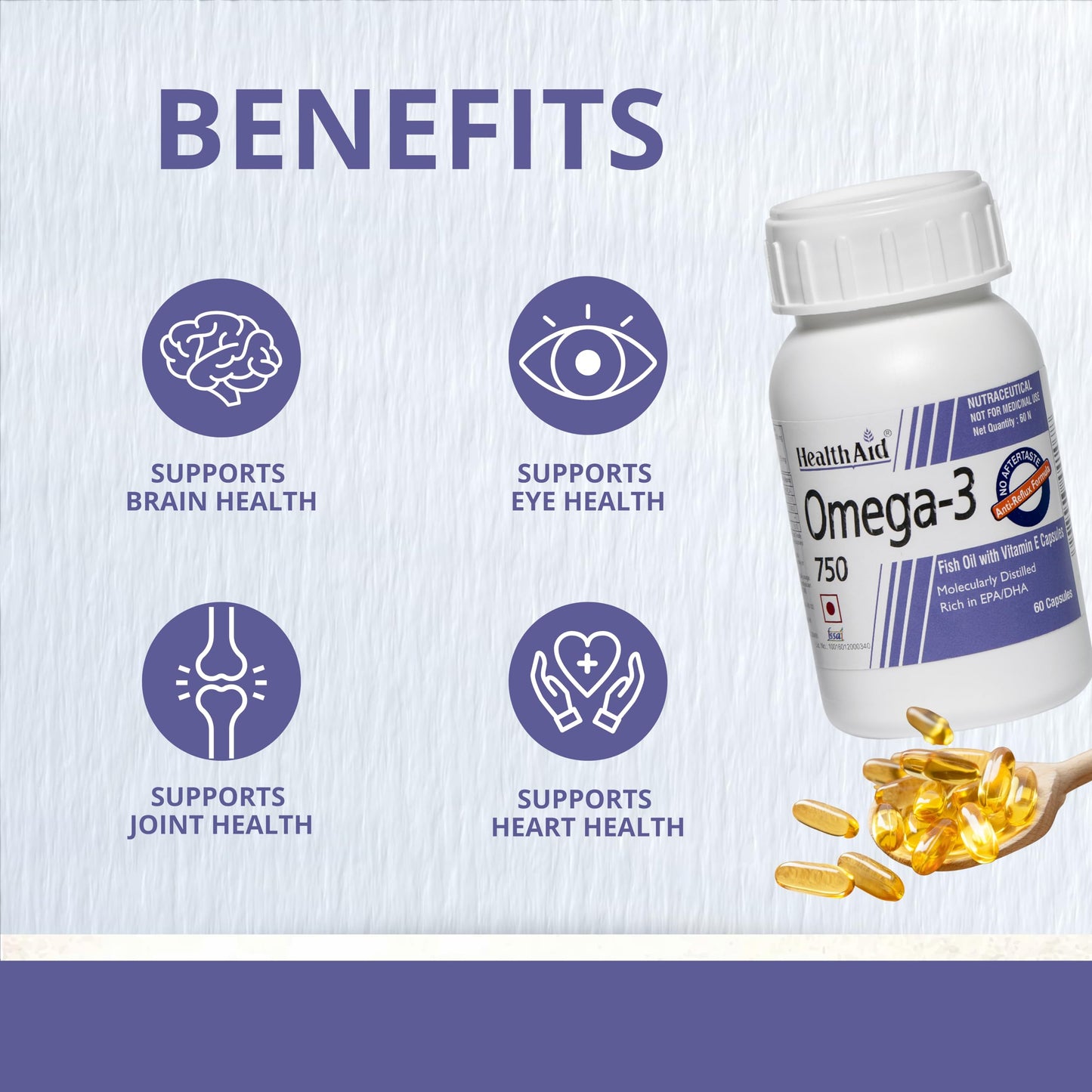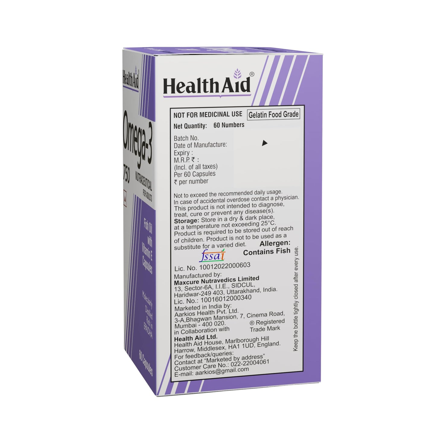 HealthAid Omega- 3 750mg (EPA 425mg, DHA 325mg) - 60 Capsules | vitamin E capsules with fish oil