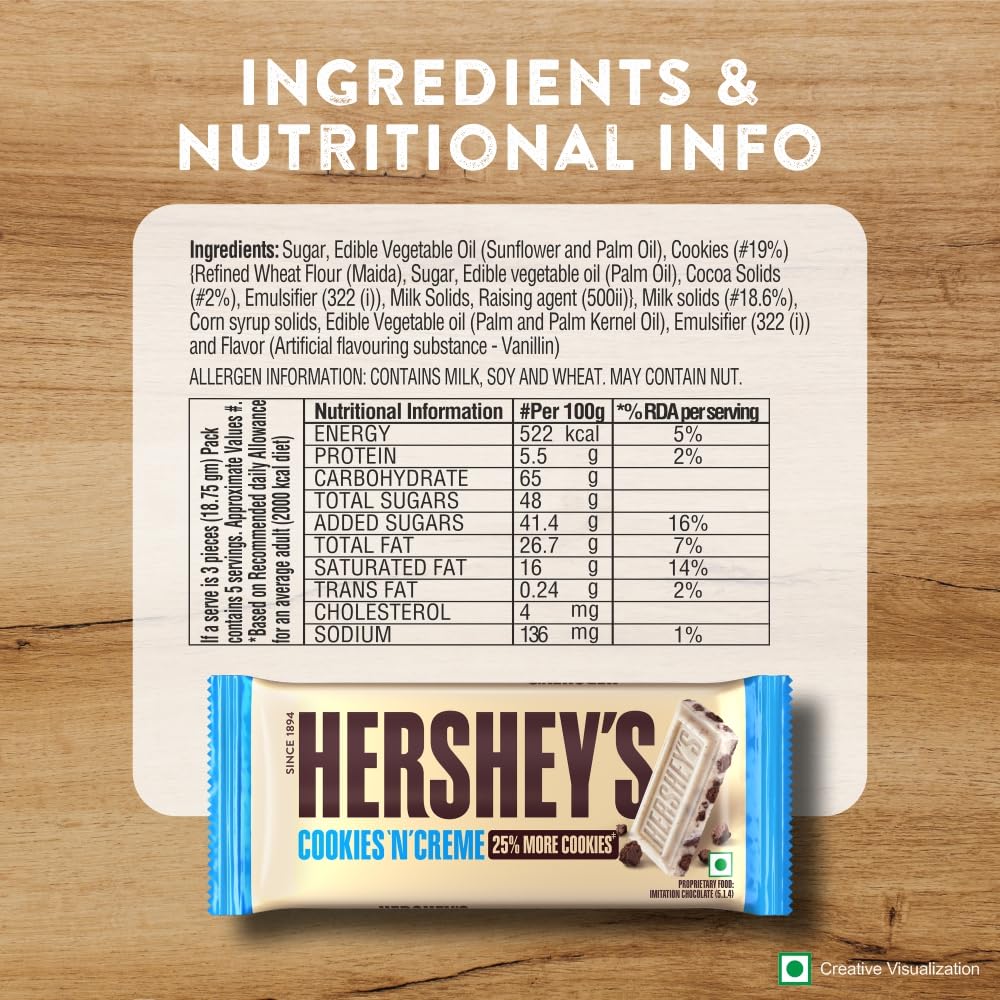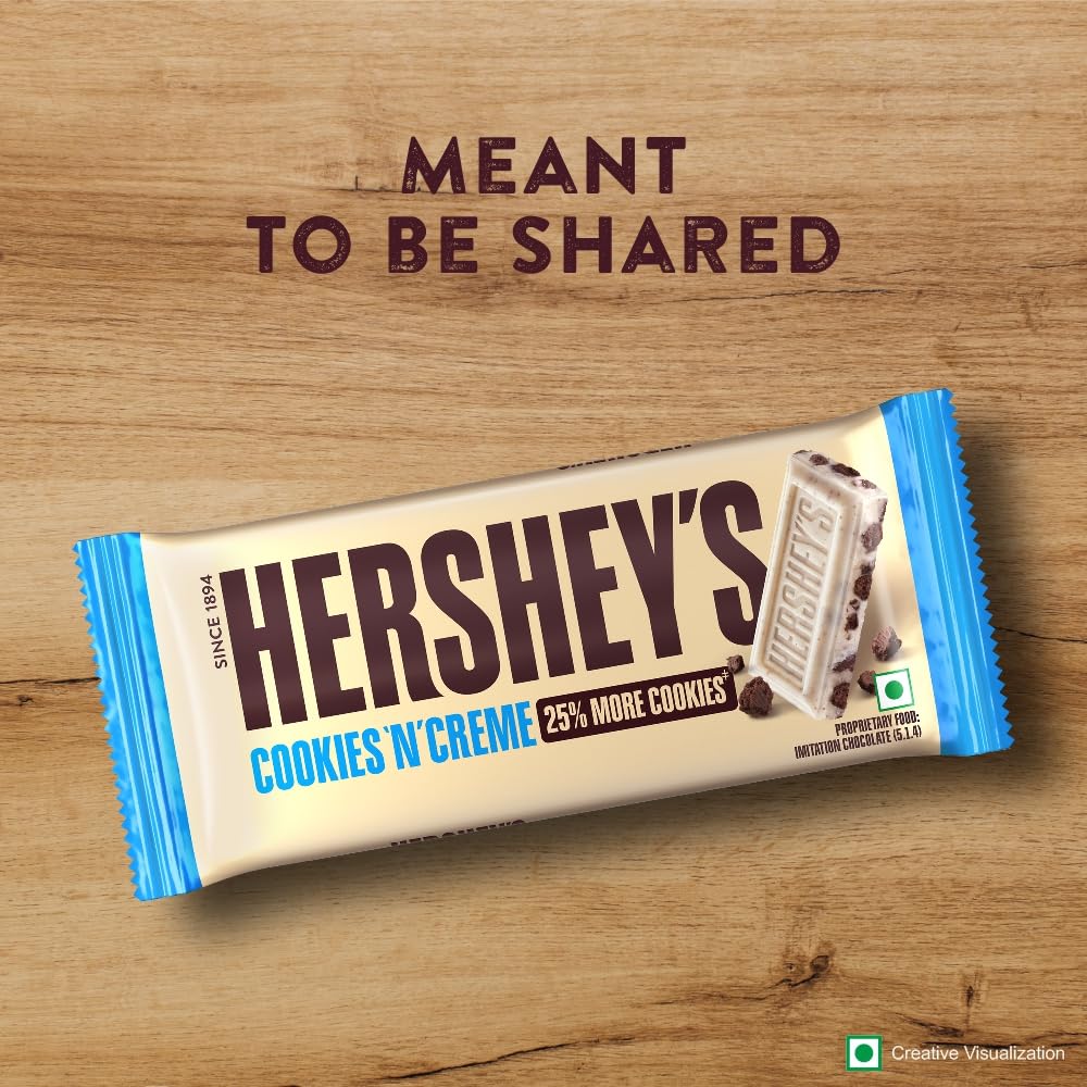 - Dive into a world of indulgence: Rich, creamy goodness with cookie bits. Indulge in HERSHEY’S BARS Cookies ‘N’ Creme.