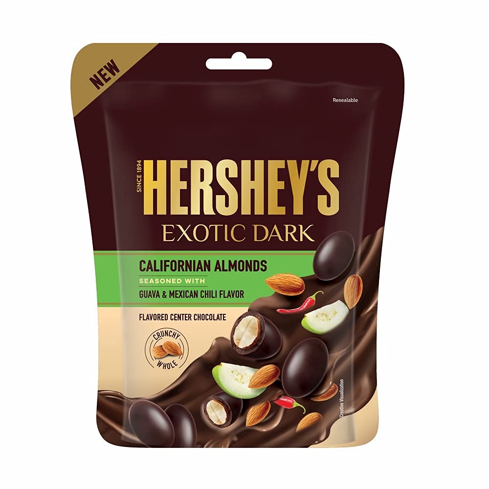 - Hershey's Exotic Dark is one of its kind premium dark cocoa rich chocolate in Hershey’s chocolate portfolio. It is a unique combination of Dark coca rich chocolate & premium, exotic flavors. We believe that you shouldn’t have to compromise on amazing chocolate taste. While Hershey's Exotic Dark with fruit flavored center continues to be our consumer’s ever favorite, our new launch has Roasted, Crunchy, Whole, Californian Almonds sprinkled with Blackberry Flavor and in turn coated with delicious, creamy, dark cocoa rick chocolate giving our consumers altogether new exotic experience.