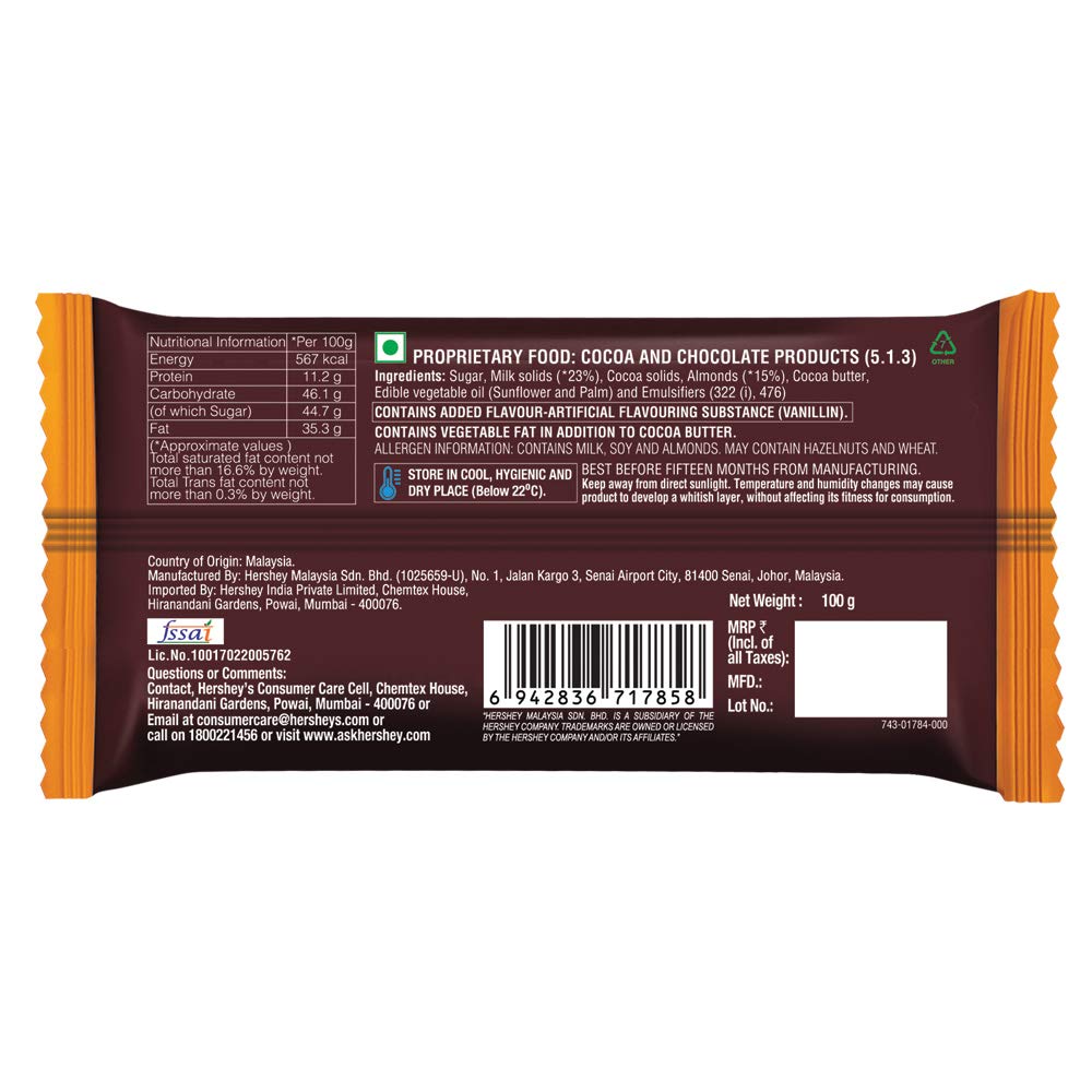 HERSHEY'S Whole Almonds Bar | A Crunchy Chocolaty Treat 100g - Pack of 2