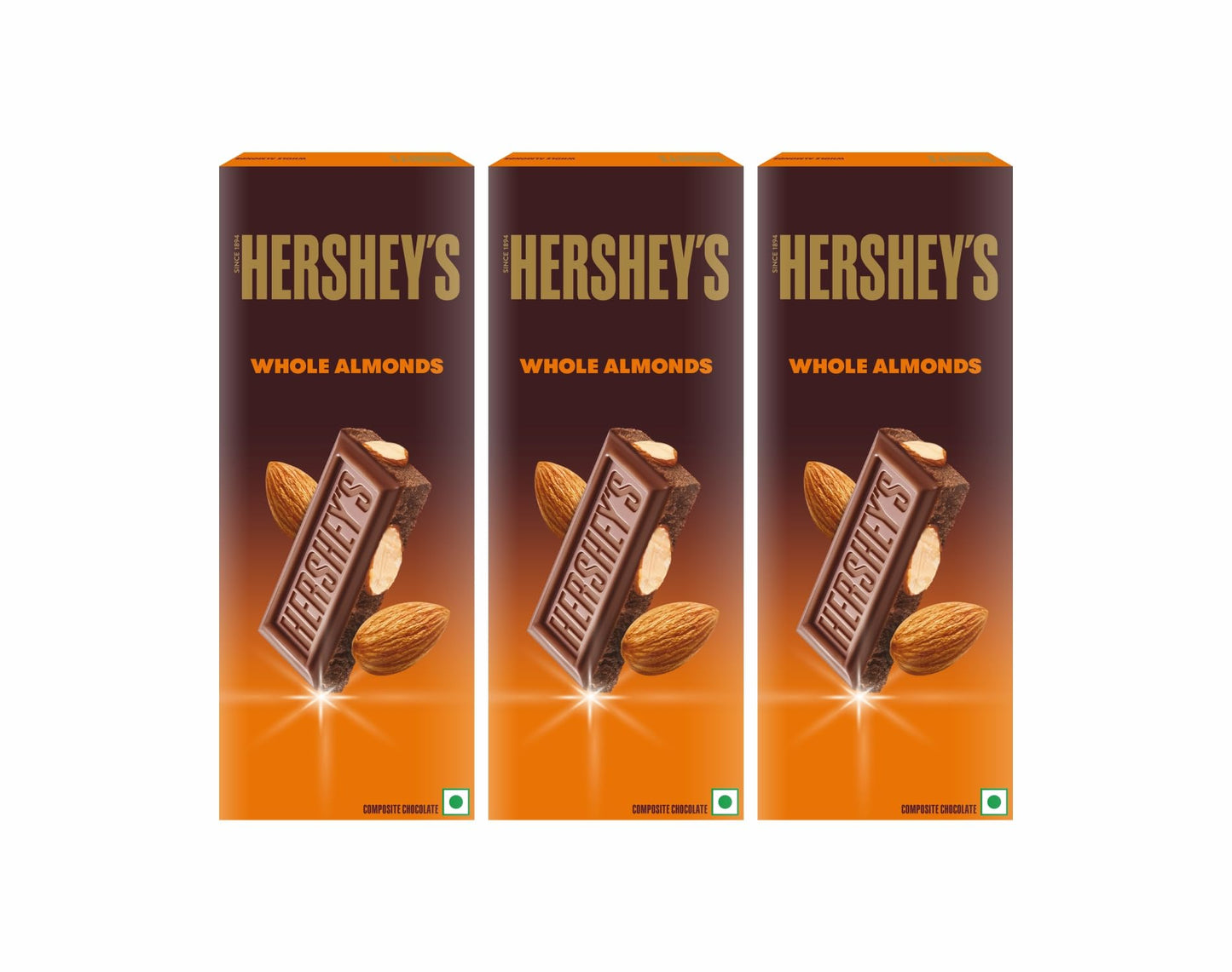 - This is a pack of 3 bars of 40 G each. Also available in 100 G pack options.;Hershey's Whole Almond Bars come with the goodness of whole almonds.;These wholesome, tasty and delicious bars offer a delectable taste in every bite to satisfy your sweet urges.;Also available in Creamy Milk and Cookies N Crème flavors.;Hersheys Bars are perfect for snacking, sharing, or gifting