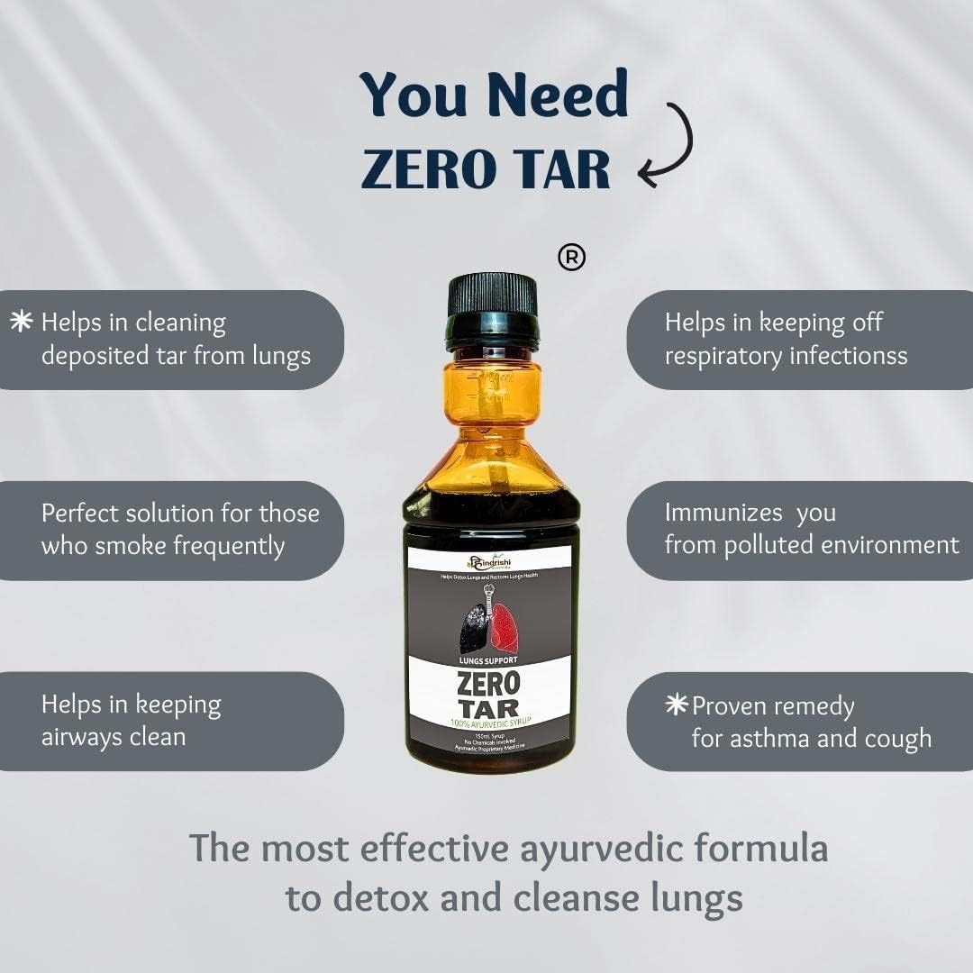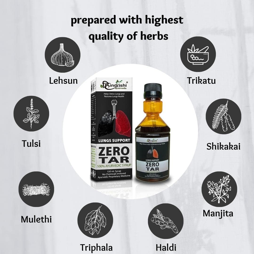 - SUPPORT FOR YOUR LUNGS - Hindrishi Zero Tar Syrup is a powerful blend of herbs, vitamins and enzymes that helps detox your lungs and respiratory system to get rid of waste caused by smoke in air, air pollution and environmental toxins.