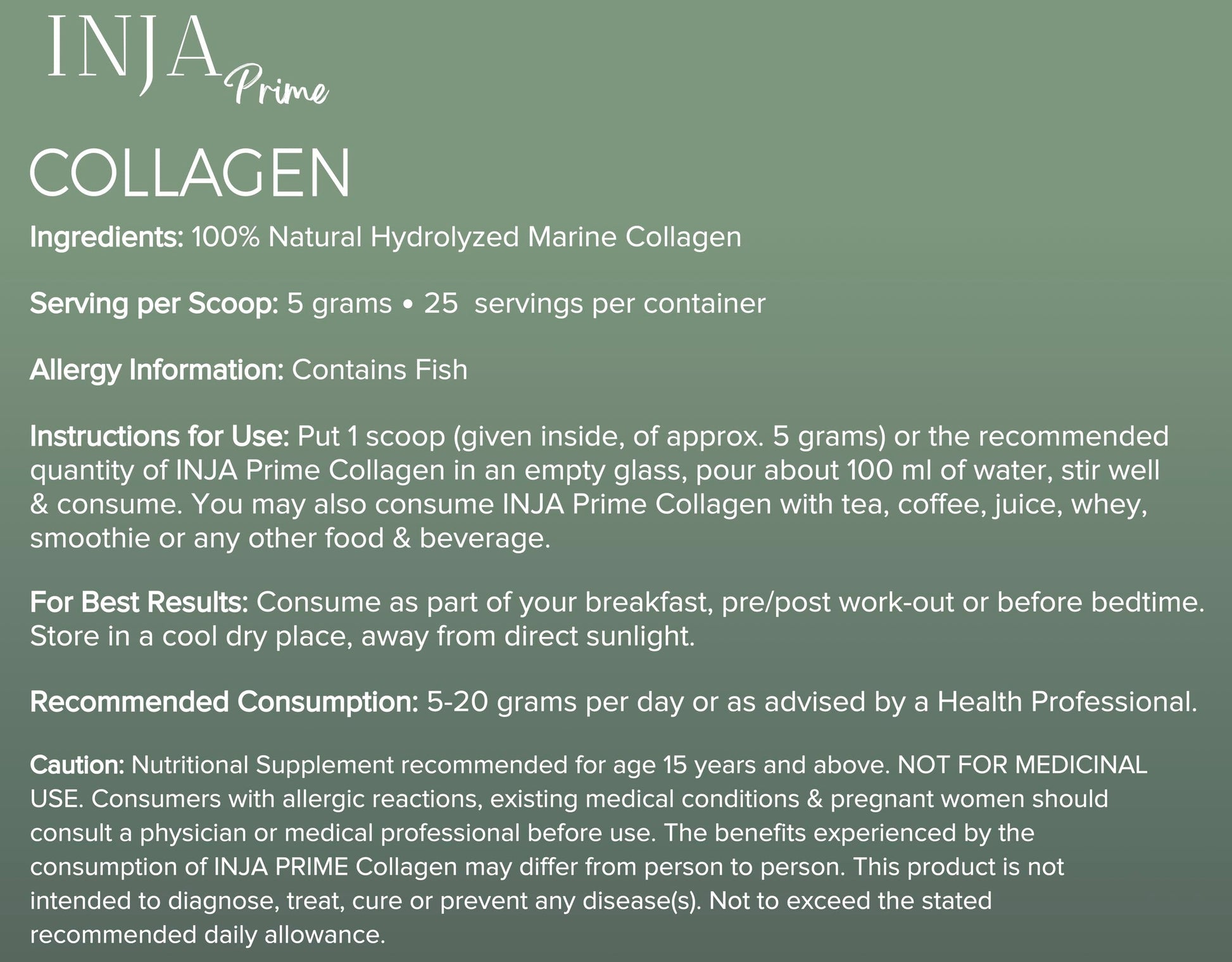 - ๐๐ฎ๐๐ ๐๐ผ ๐จ๐๐ฒ: Simply mix one scoop (5 grams) of INJA Collagen powder with 100 ml of water daily. Conveniently packaged in a 125-gram jar, making it easy to incorporate into your daily routine.