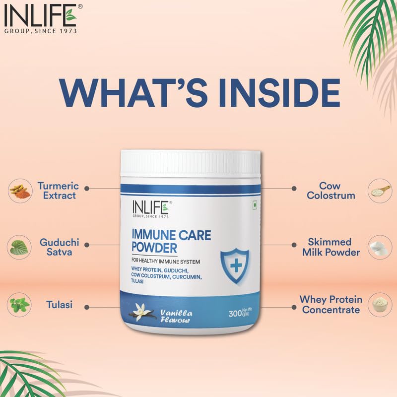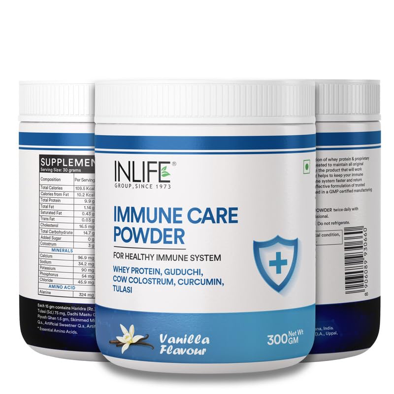 - INLIFE Immune Care powder enriched with Whey Protein is manufactured to high quality standards. It is an excellent combination of Whey Protein with Turmeric (Curcumin), Guduchi, Tulasi & Colostrum that helps to boost immunty.
