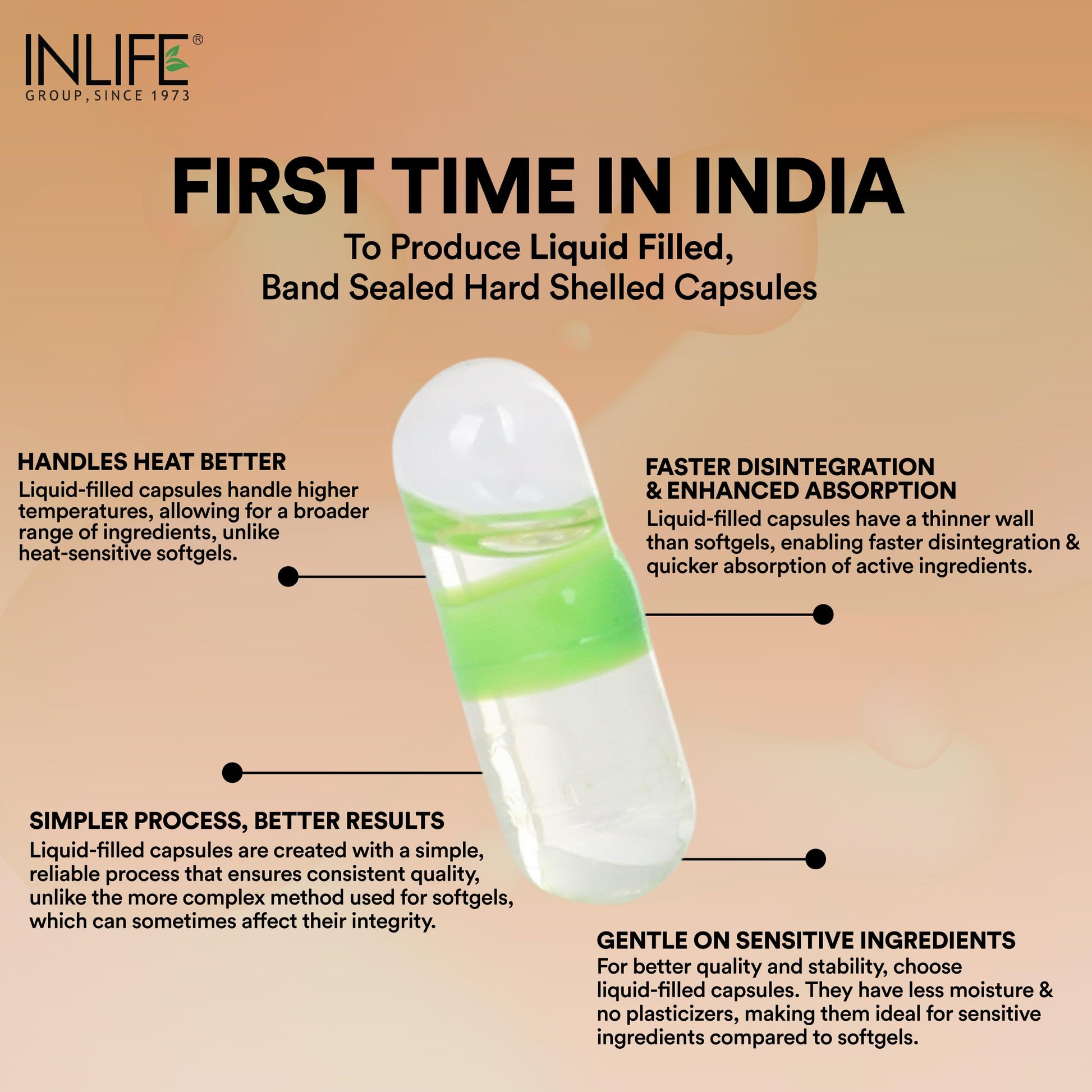 - INLIFE Liquid Filled Capsules has more advantages over soft gels like, low moisture intake, enhanced bioavailability and high absorption rate.