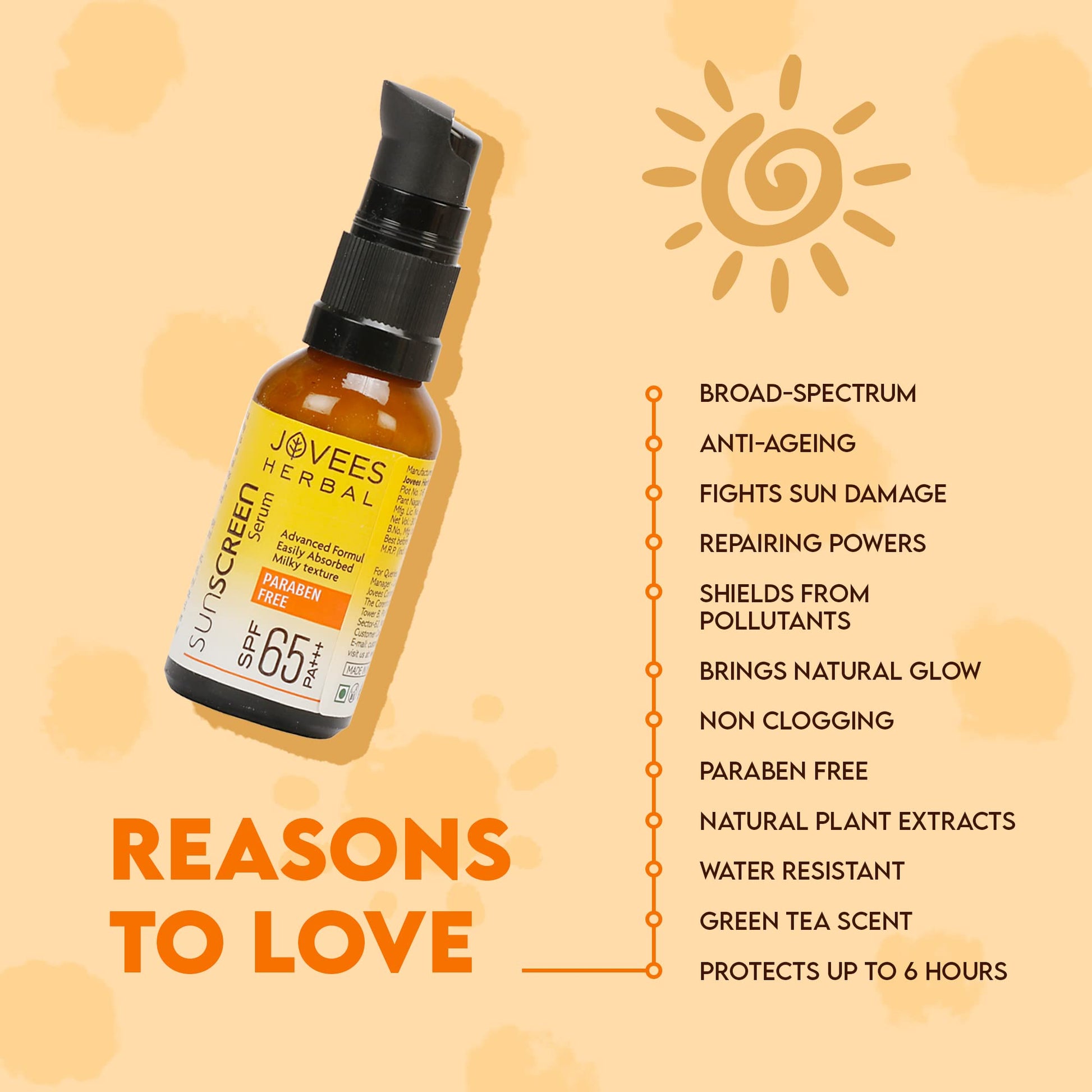 - Jovees Suncreen Serum SPF 65 is a gel based , paraben free ,double-protection, anti-aging skincare product that protects your skin from UVA and UVB radiation and repairs the damage caused by them.