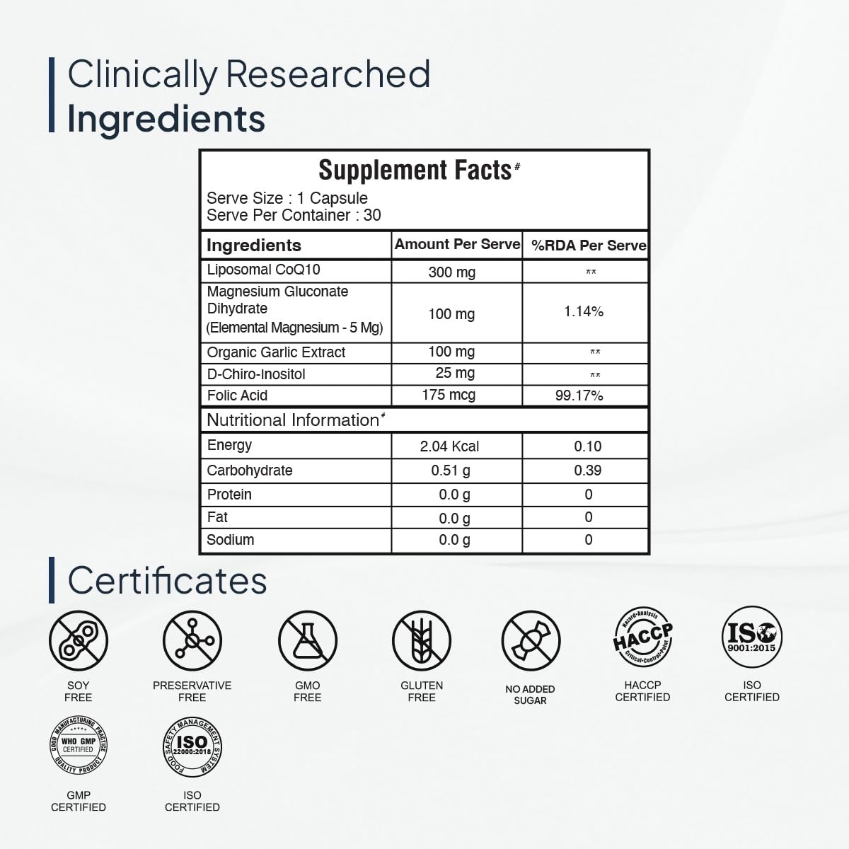 Miduty Happy Heart - Liposomal High Absorption CoQ10-300 mg With Methyl Folate, D-Chiro-Inositol, Magnesium | Helps in Blood Pressure Control & Heart Health Supplement - 30 Capsules