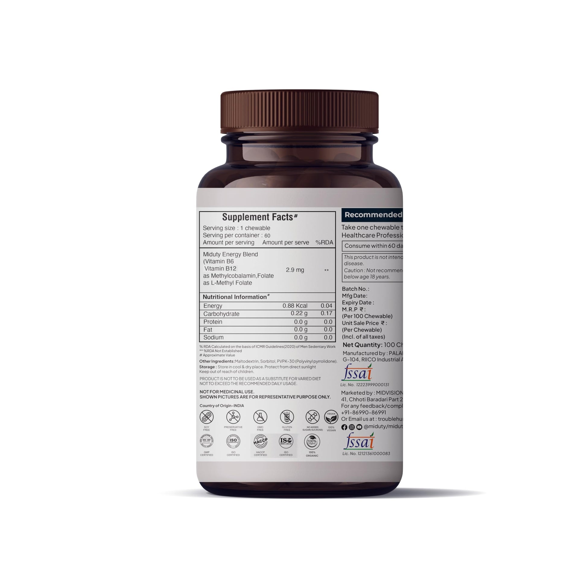 - ๐ง๐ฅ๐๐ฃ๐๐ ๐๐๐ก๐๐๐๐ง ๐ช๐๐ง๐ ๐๐ฒ, ๐๐ต & ๐๐ญ๐ฎ: Midutyโs B-Complex chewable combines three essential B-vitaminsโVitamin B6 (P5P), Vitamin B9 (Methyl Folate), and Vitamin B12 (Methylcobalamin)โformulated in their active forms to support key biochemical processes in the body, including nerve function and cellular metabolism.