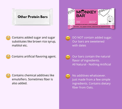 - TIRED OF TASTELESS, SYNTHETIC and SUGARY PROTEIN BARS? We understand your pain as most protein bars contain artificial sweetener like Maltitol, full of chemical additives and synthetic flavours. You deserve a clean, natural and a delicious real food protein bar – Try Monkey Bars.