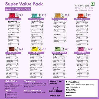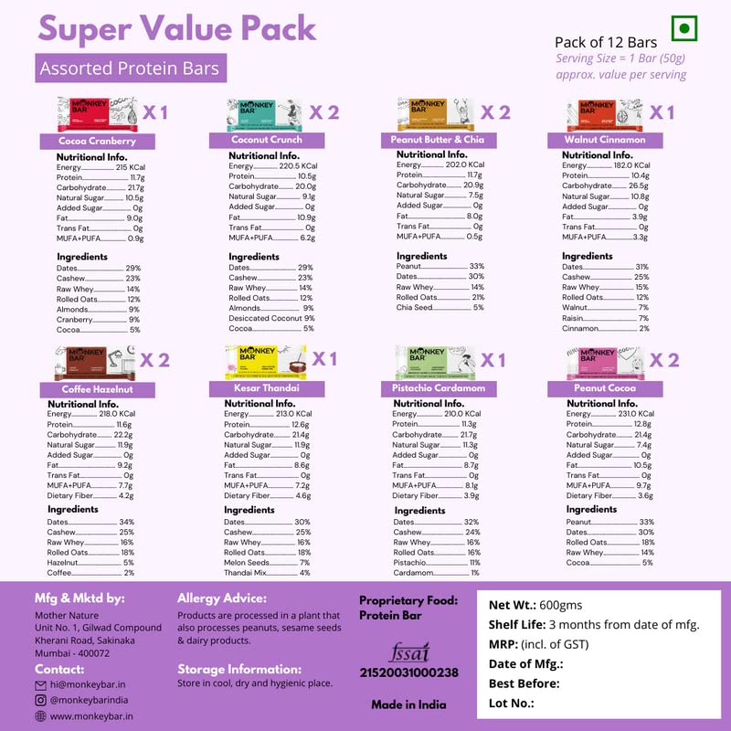 MONKEY BAR - Assorted Protein Bars SUPER VALUE PACK - Pack of 12 X 50g, 10-13g Protein, Healthy Energy Bar with No Added Sugar, All Natural Ingredients & 8 Delicious Flavours