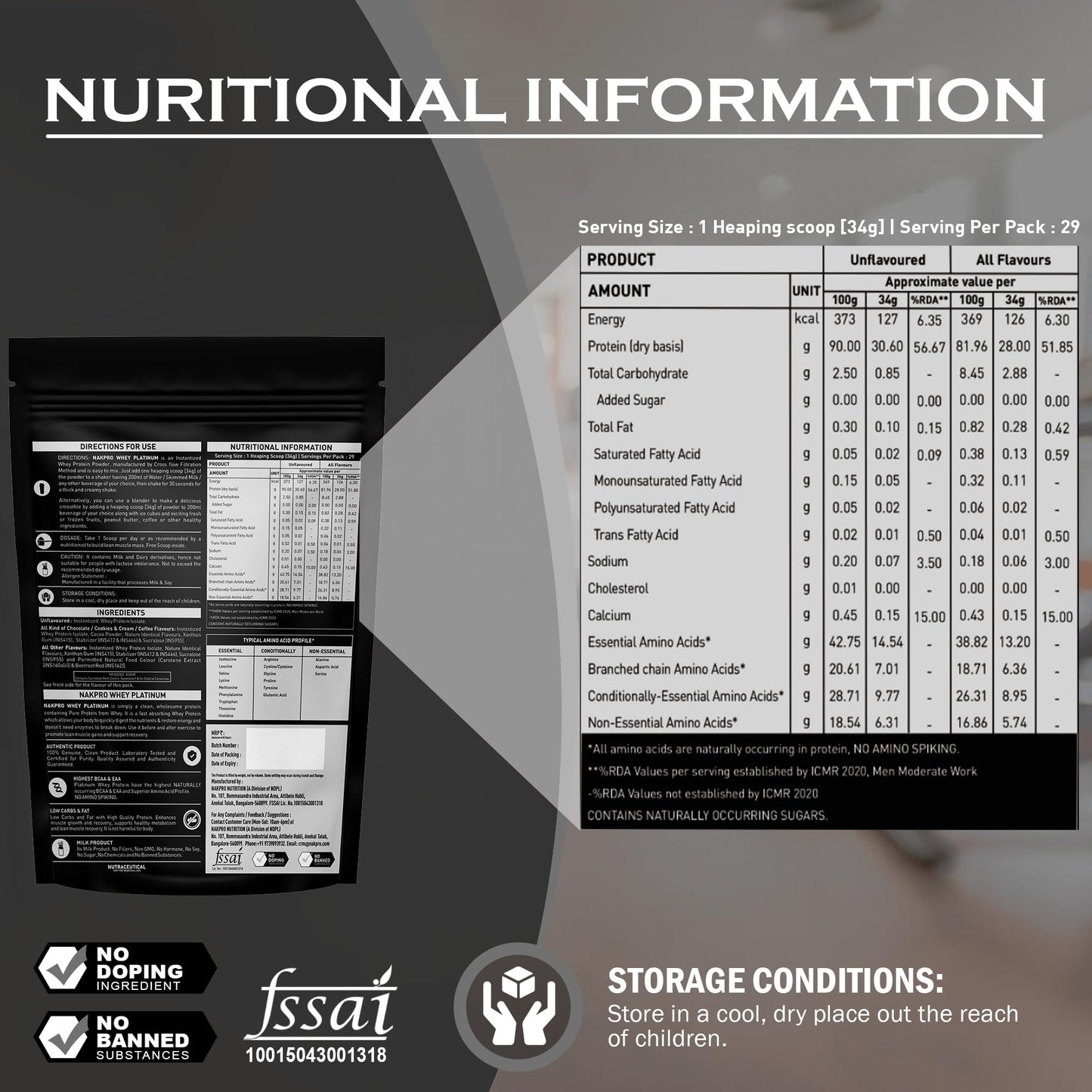Nakpro Platinum 100% Whey Protein Isolate 30.4g Protein, 6.96g BCAA & 5.38g Glutamine - 1Kg Unflavoured (30 Servings)