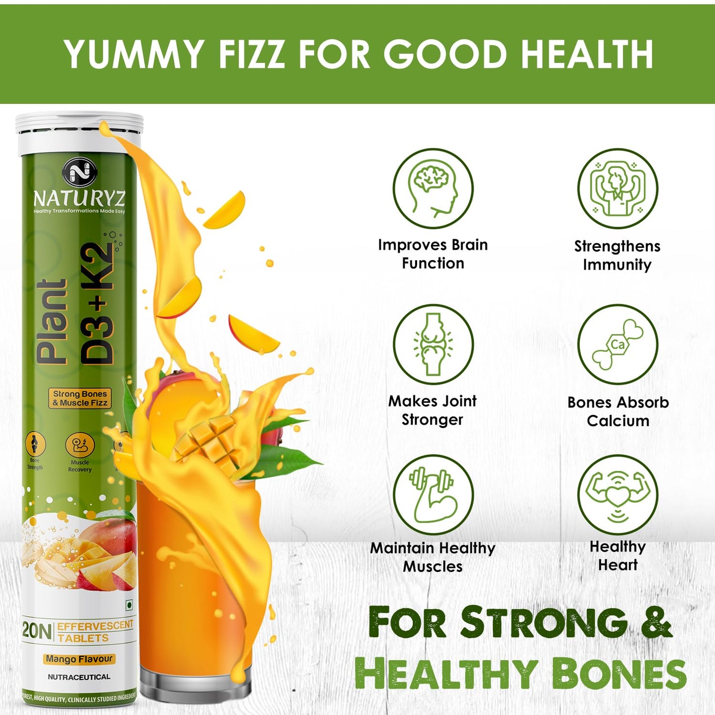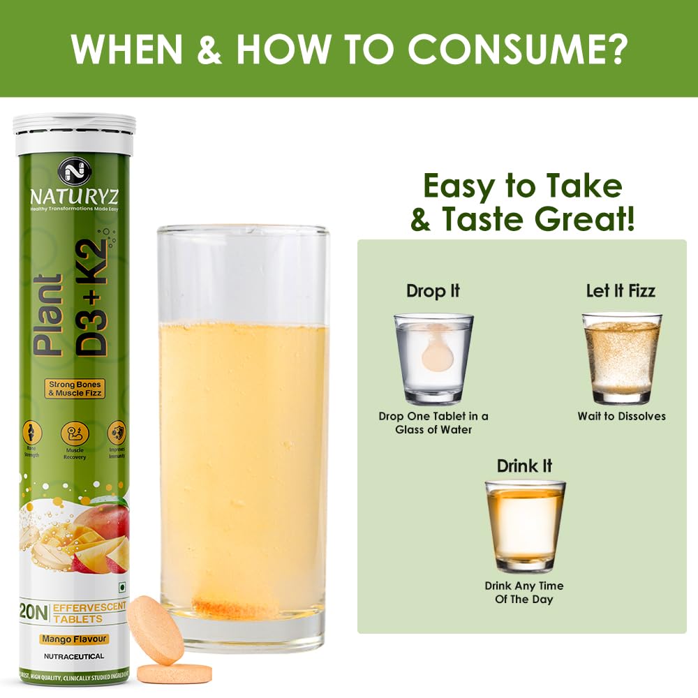 - ✅ FAST ACTING EFFERVESCENT TECHNOLOGY: Naturyz Plant D3K2 Effervescent tablets have faster absorption rates and get dissolved faster as compared to other forms such as tablets, powders, liquids, etc. These Effervescent tablets dissolve completely and homogeneously providing the complete benefits of the active ingredients