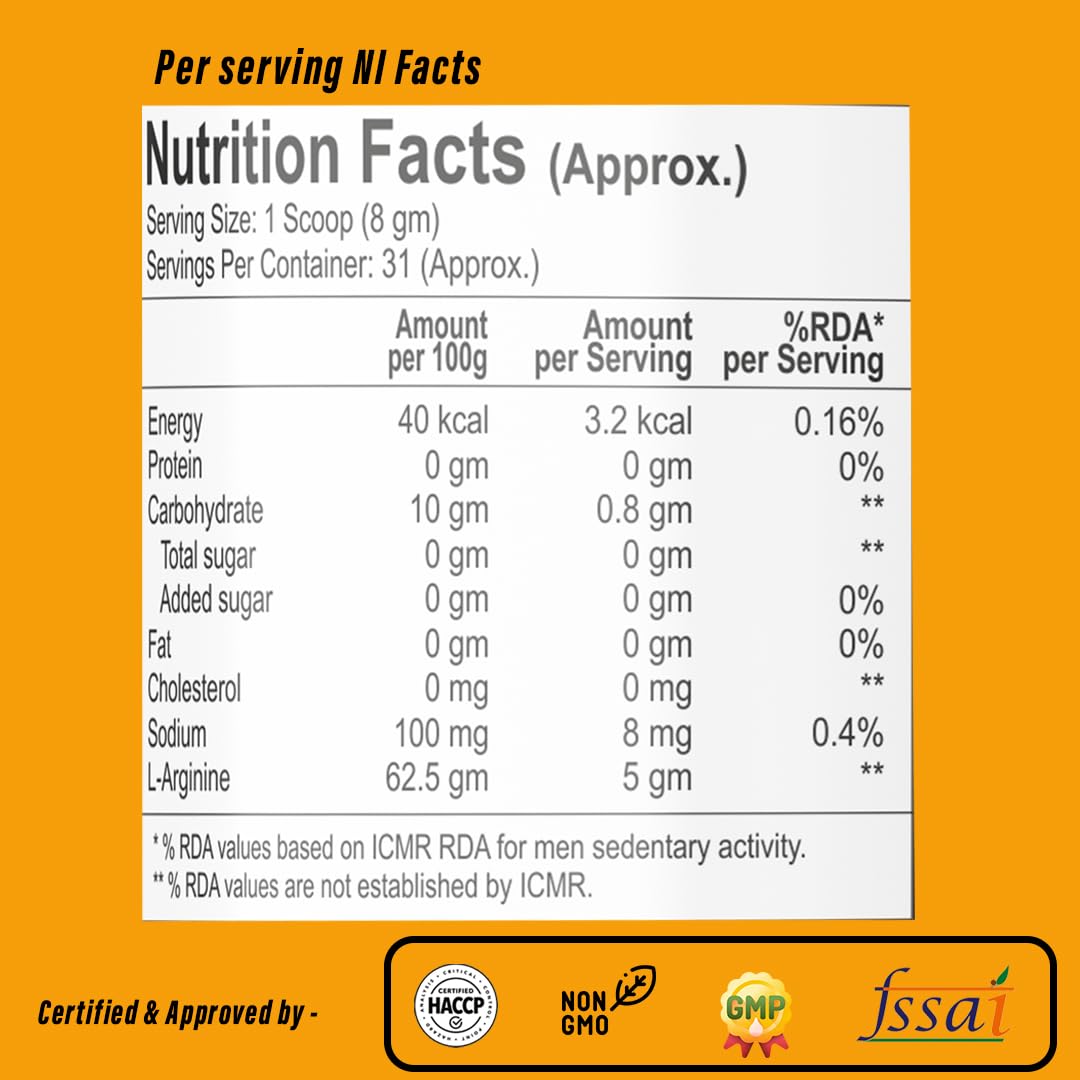 - Increase Energy & Performance: A powerful amino acid, L-Arginine boosts energy and enhances physical performance. It supports sustained endurance and reduced fatigue during exercise, helping you achieve your fitness goals faster.