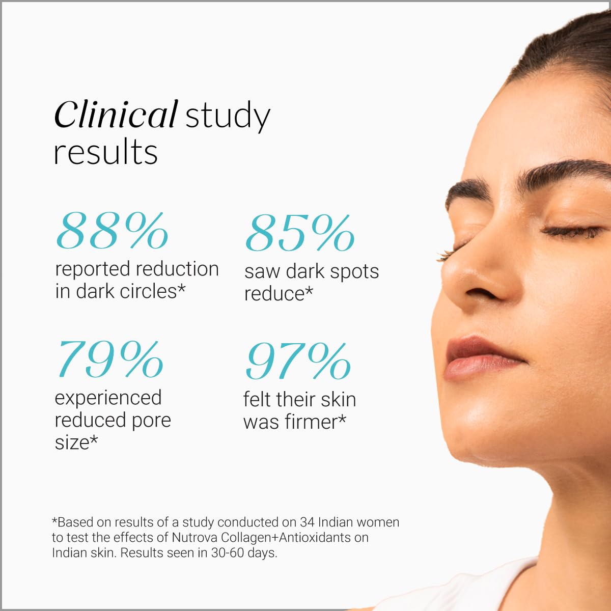 - CLINICALLY TESTED ON INDIAN SKIN: In a first-of-its-kind clinical study on Indian women, Nutrova Collagen+Antioxidants has shown to improve skin elasticity, hydration and texture. It also reduced under-eye dark circles, skin dullness, wrinkles, pigmentation spots and pore size.