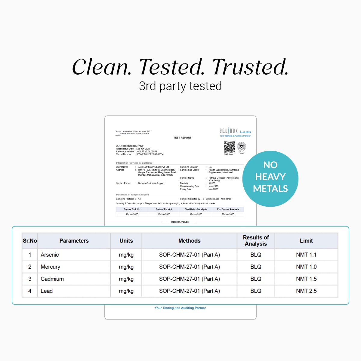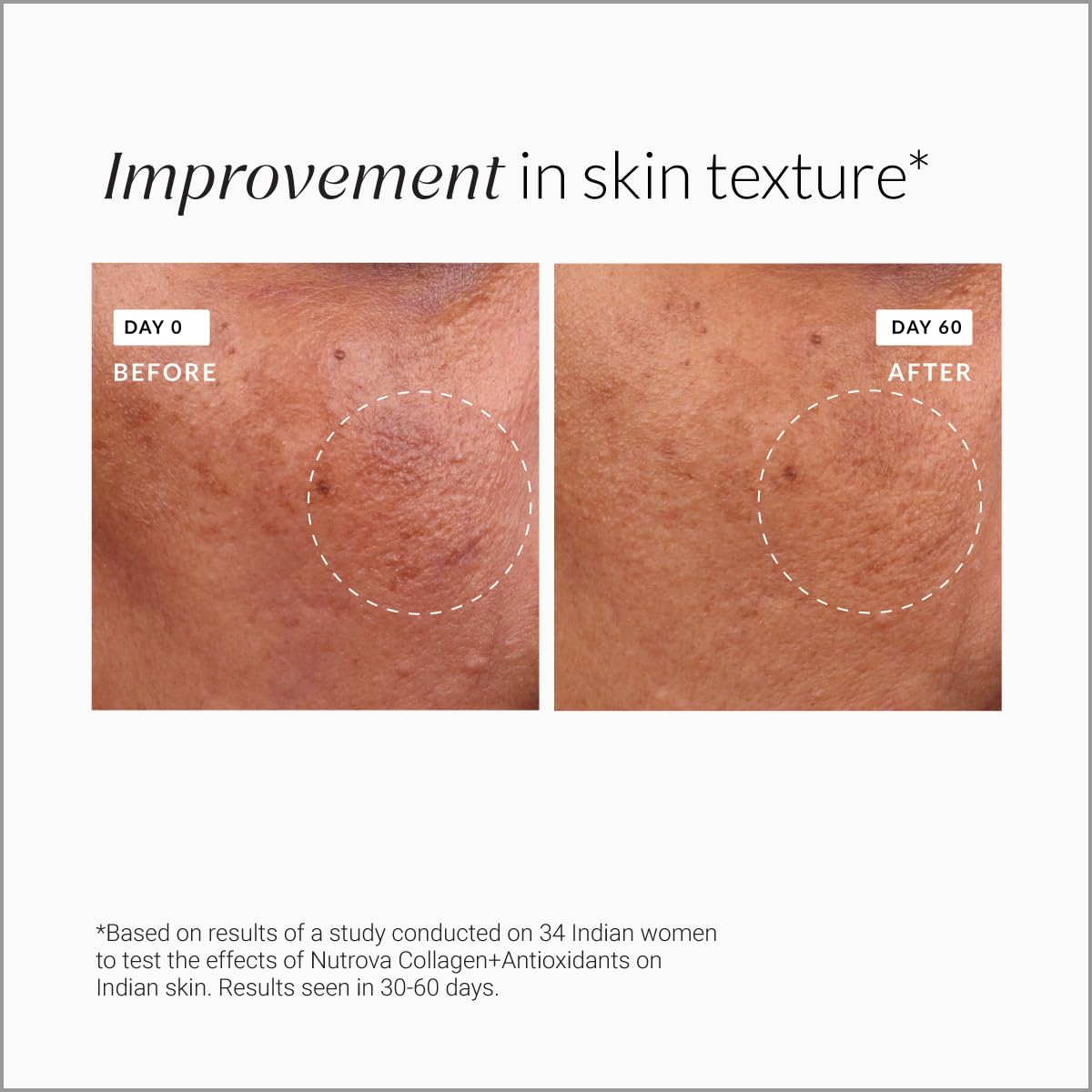 - CLINICALLY TESTED ON INDIAN SKIN: In a first-of-its-kind clinical study on Indian women, Nutrova Collagen+Antioxidants has shown to improve skin elasticity, hydration and texture. It also reduced under-eye dark circles, skin dullness, wrinkles, pigmentation spots and pore size.