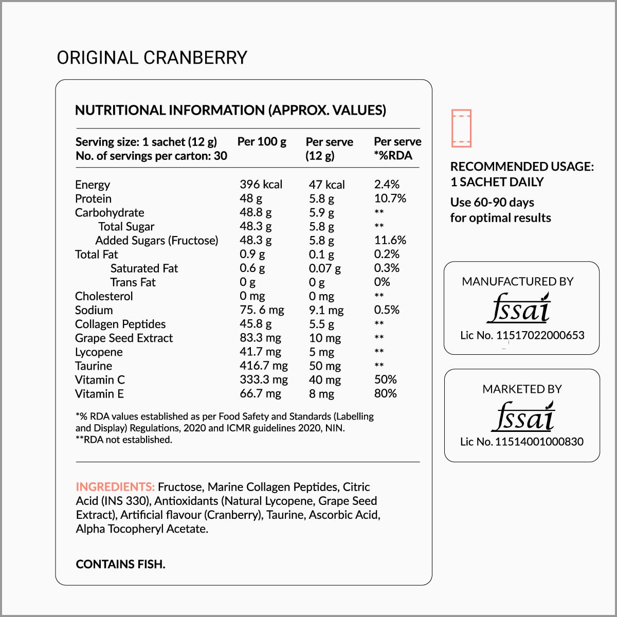 - HOW IT WORKS: Our formulation contains hydrolyzed collagen with smaller chains of collagen that the body can easily absorb and use. Along with the other skin-healthy nutrients, it comes in a powder form (in sachets) that can be easily mixed into water. It has a cranberry flavour, contains no artificial sweeteners and is tested for heavy metals.