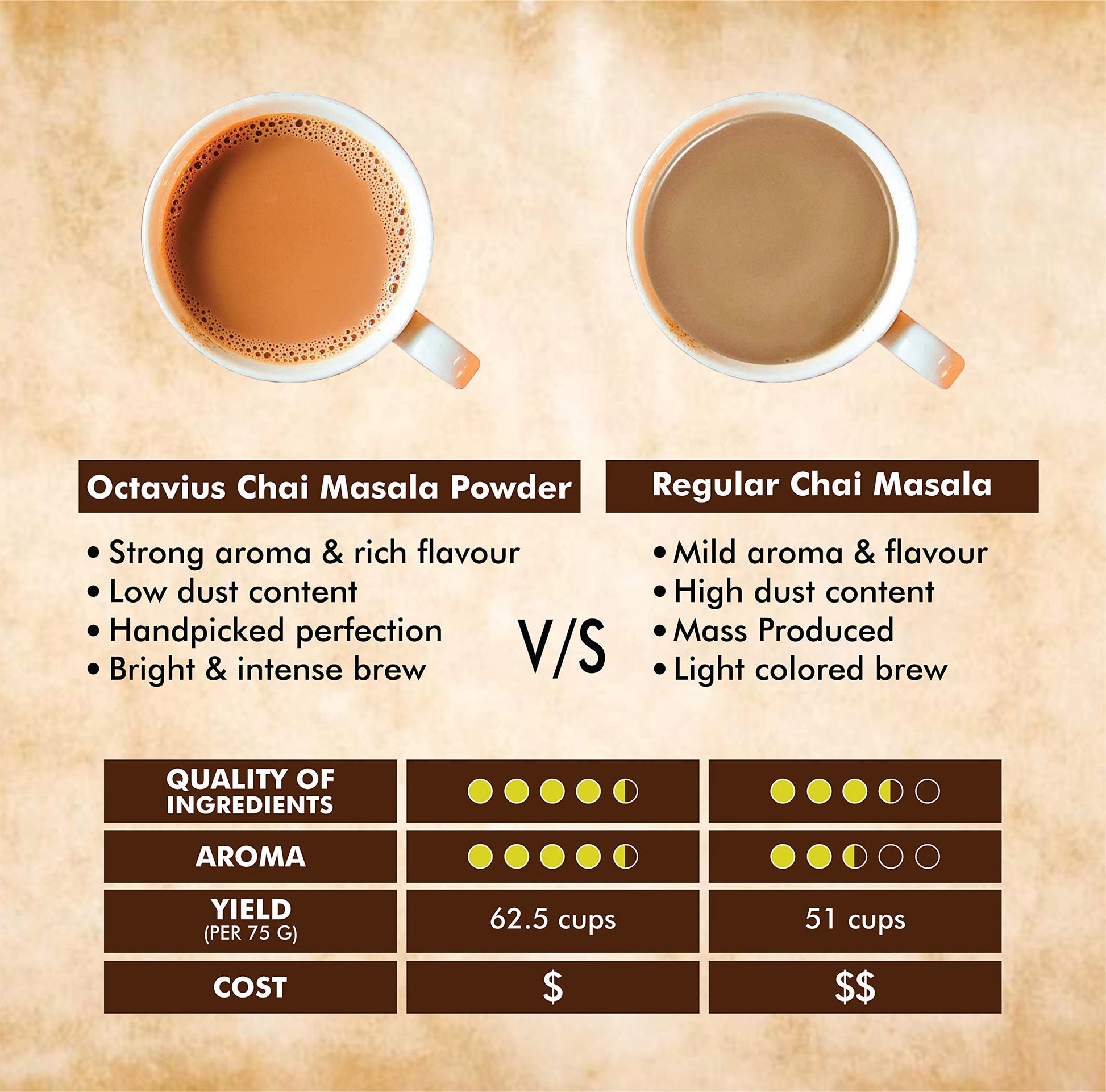 - AROMATIC CHAI MASALA POWDER - This age old aromatic Chai Masala is the main ingredient in making the very popular Masala Chai. A regular cup of tea can be transformed into the rich,exotic Indian masala chai with the addition of chai masala powder.Octavius Chai Masala is a mixture of the aromatic Indian spices Cardamom, Cinnamon, Ginger, Black Pepper and Clove and is the perfect fragrant blend to spice up your tea & make the perfect Masala Chai.