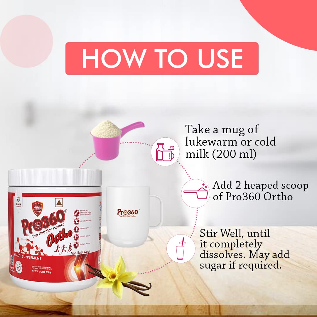 Pro360 Ortho Bone and Joint Care Supplement Nutrition Powder with Glucosomine Chondroitin MSM Collagen Peptides Boswellia Serrata Hyaluronic Acid - Diabetic Friendly - Vanilla Flavour, 250g (Nonveg)