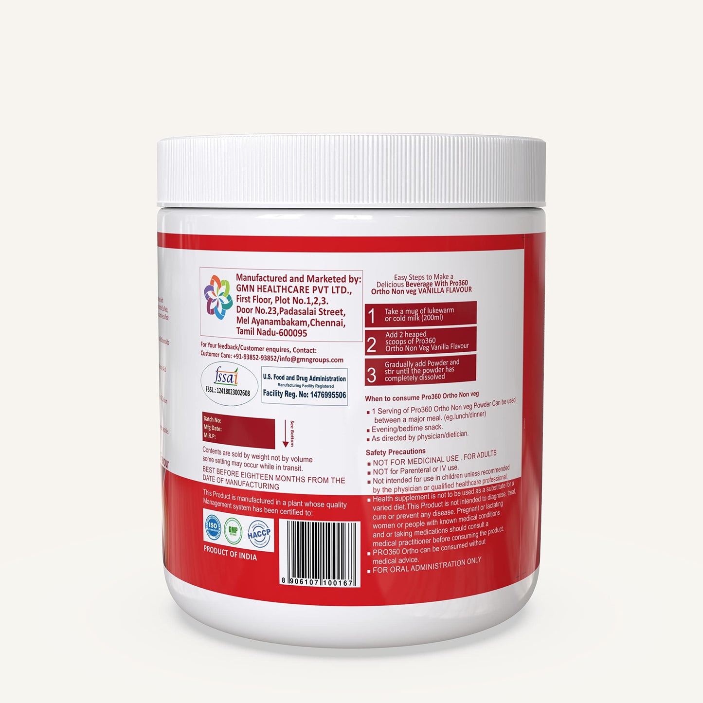 - Ortho Solution: Pro360 ortho nonveg protein powder is the best nutritional supplement for orthopedic patients to rebuild their connective tissues. Pro360 Ortho should be consumed as part of a well-balanced diet and healthy lifestyle which helps in getting complete ortho solution and is ideal for diabetic patients also.
